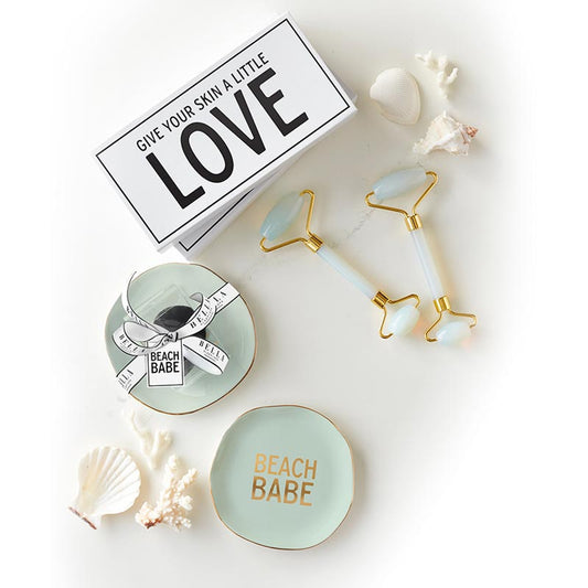Beach Babe Sage Green Ceramic Tray with Makeup Sponge Gift Set | Cosmetic Giftable Beauty Tools Set