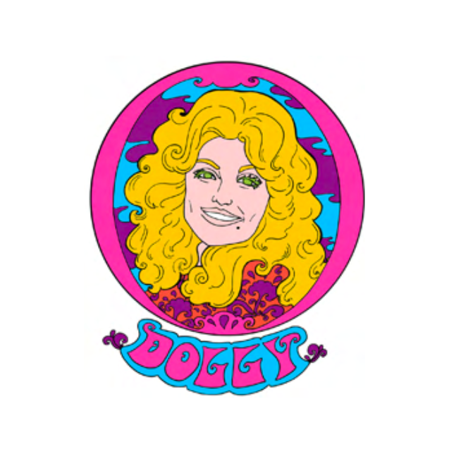 - Psychedelic pink and blue background with retro “DOLLY” lettering