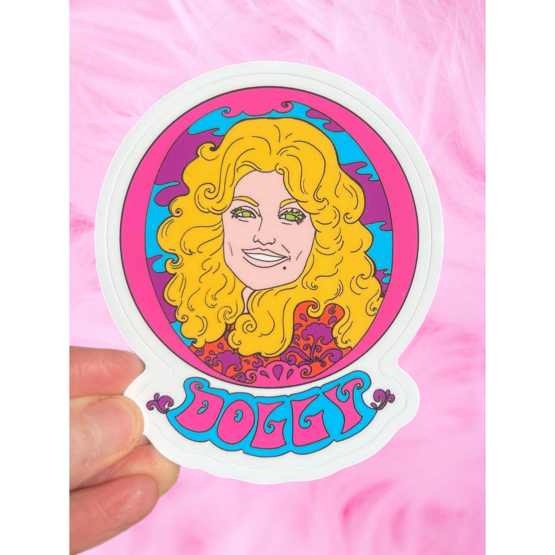 Featuring a bold, stylized illustration of Dolly Parton with her signature voluminous blonde hair, this die-cut design pops against a psychedelic pink-and-blue background, finished with her name “DOLLY” in a bubbly retro font.