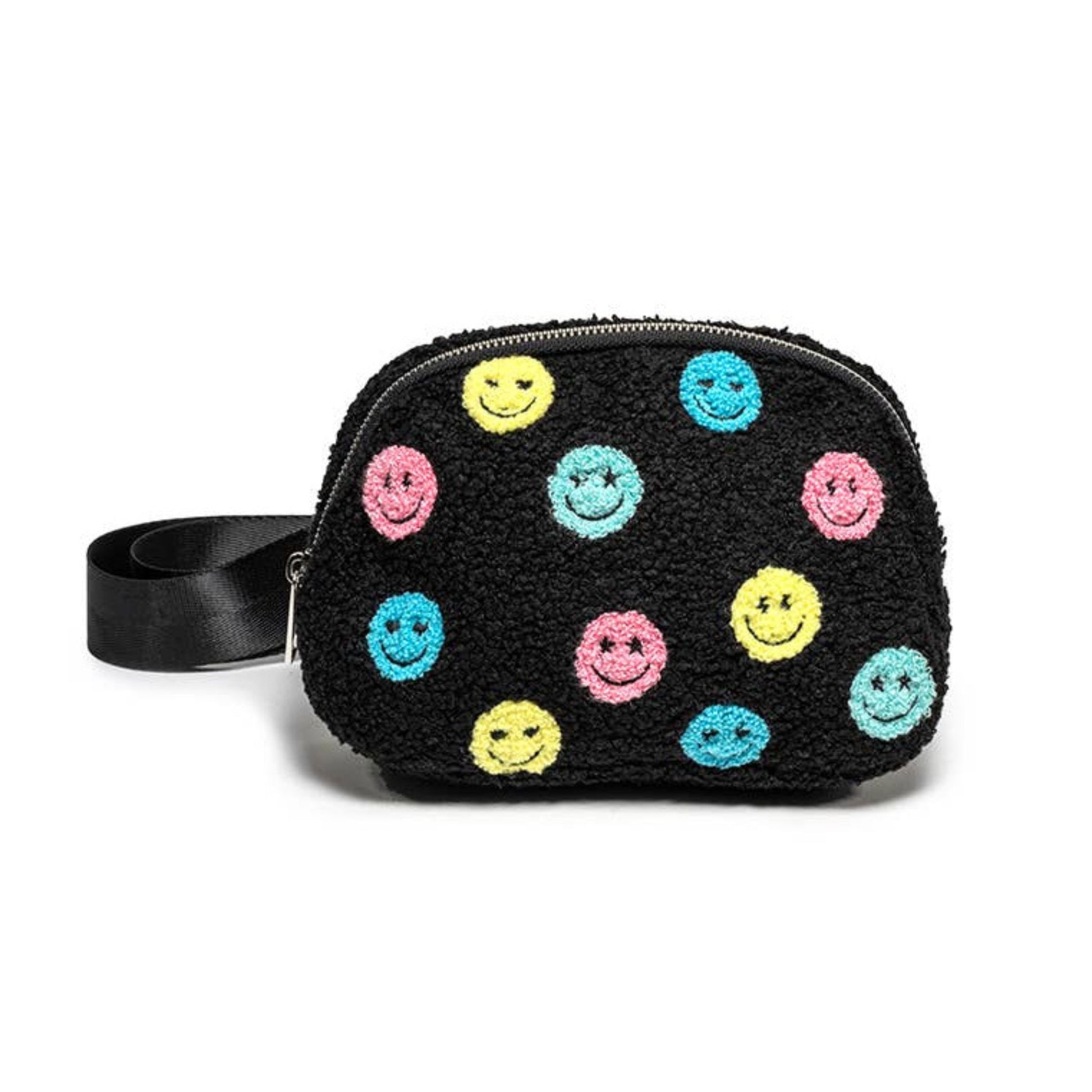 Multi-Colored Happy Faces Adjustable Belt Bag in Black | Stylish Crossbody Waist BagLow stock: 4 left