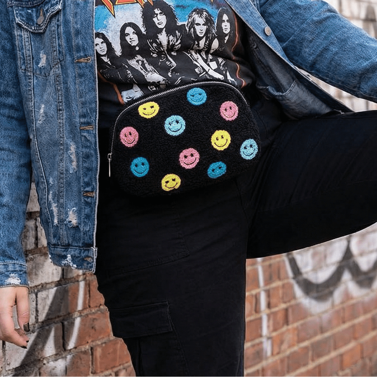 Featuring a bold, multi-colored happy face design on a sleek black background, this belt bag instantly brightens any outfit. With multiple compartments, mesh-lined pockets, and an adjustable belt, it keeps your essentials secure and organized while you stay hands-free.