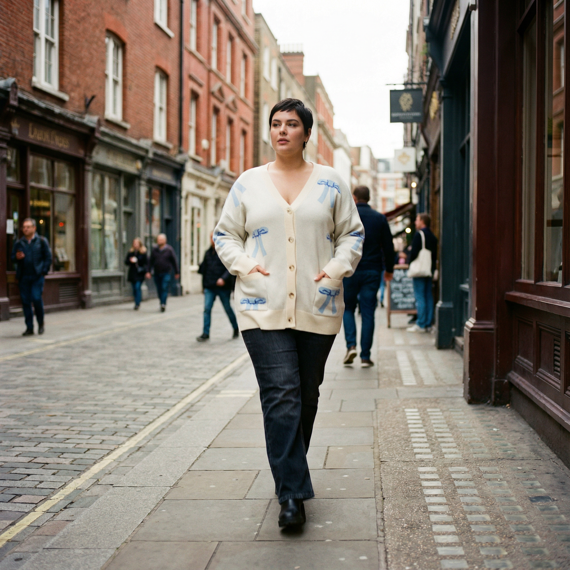 Elevate your coquettecore wardrobe with this romantic bow-patterned cardigan, perfect for achieving that sweet, vintage-inspired aesthetic. This cozy knit sweater combines classic v-neck styling with playful all-over bow intarsia, making it an essential piece for cottagecore and balletcore fashion lovers.
