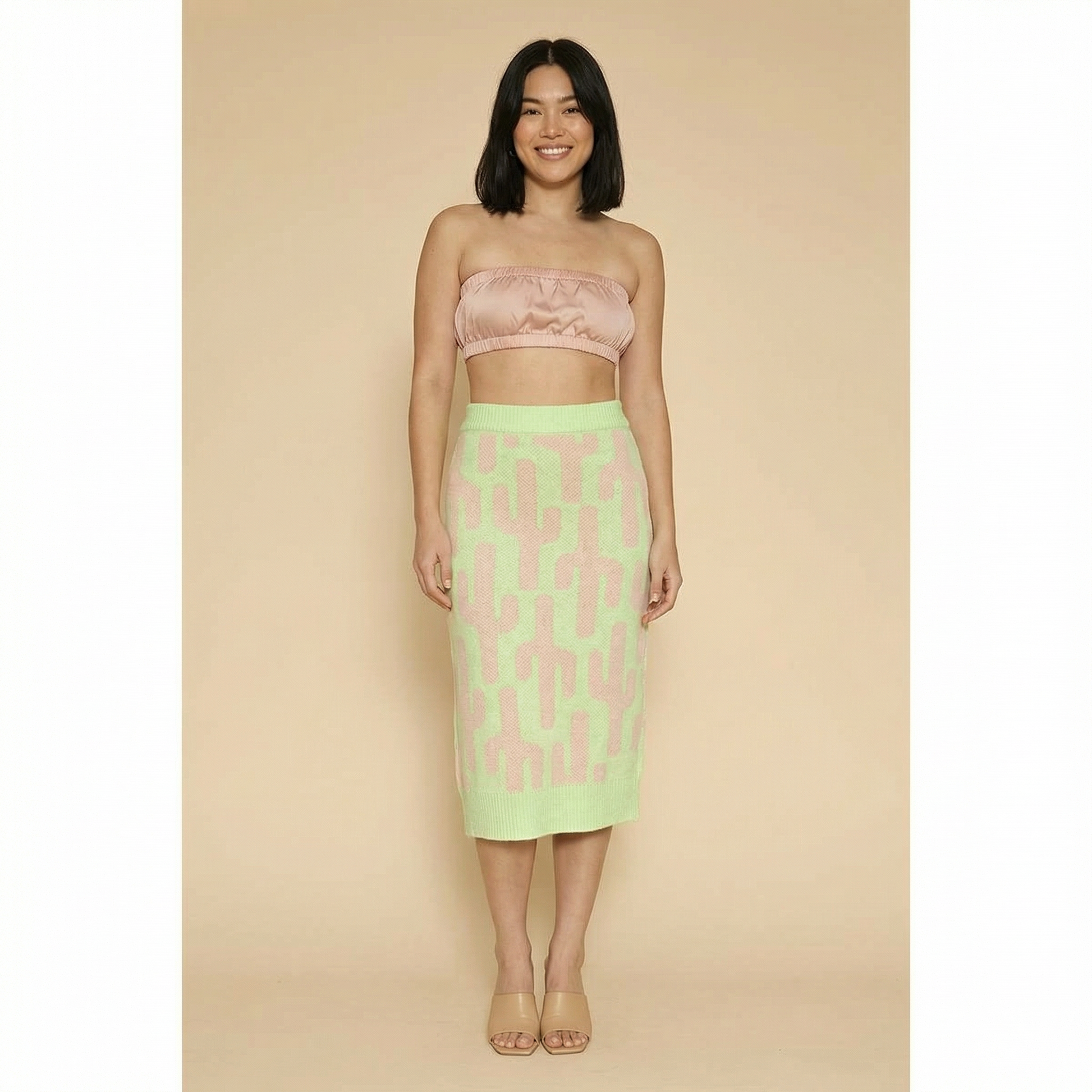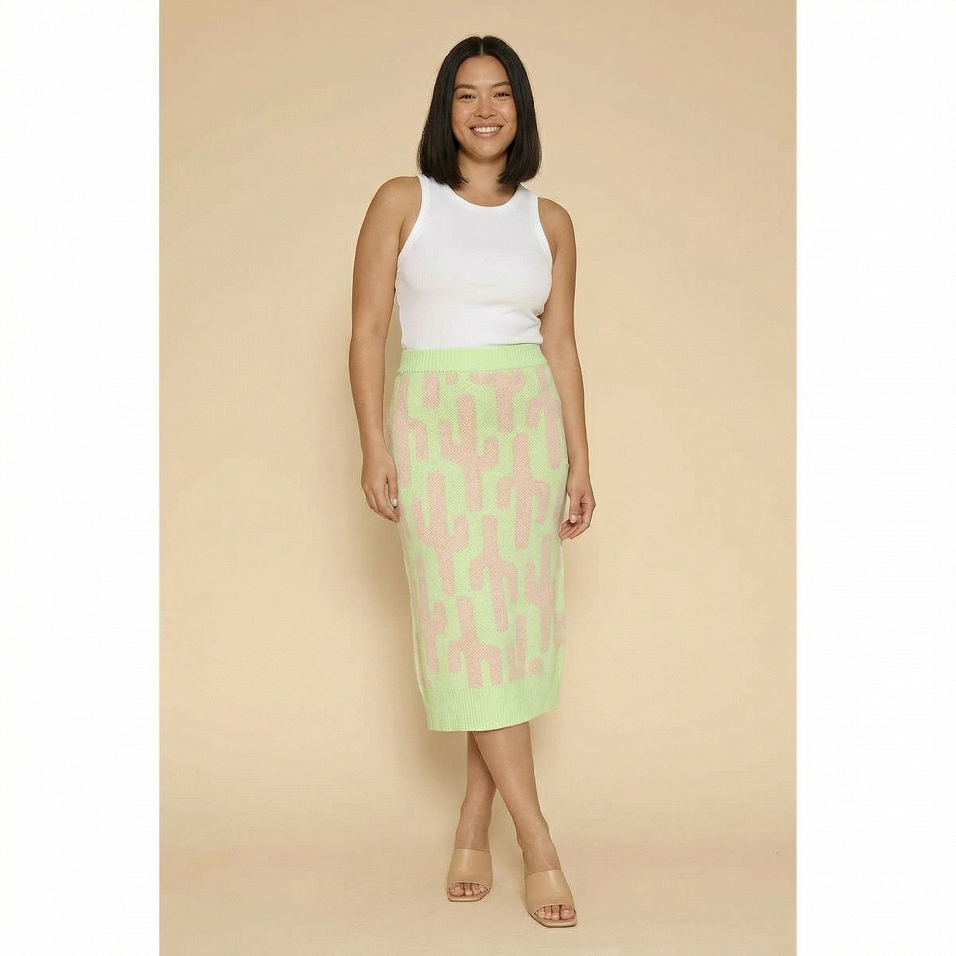 Add a playful desert-inspired touch to your wardrobe with the All Over Cactus Knit Midi Skirt. This stylish green midi skirt features an eye-catching all-over cactus intarsia pattern, making it a standout piece for casual outfits, boho styling, and desert-inspired fashion.