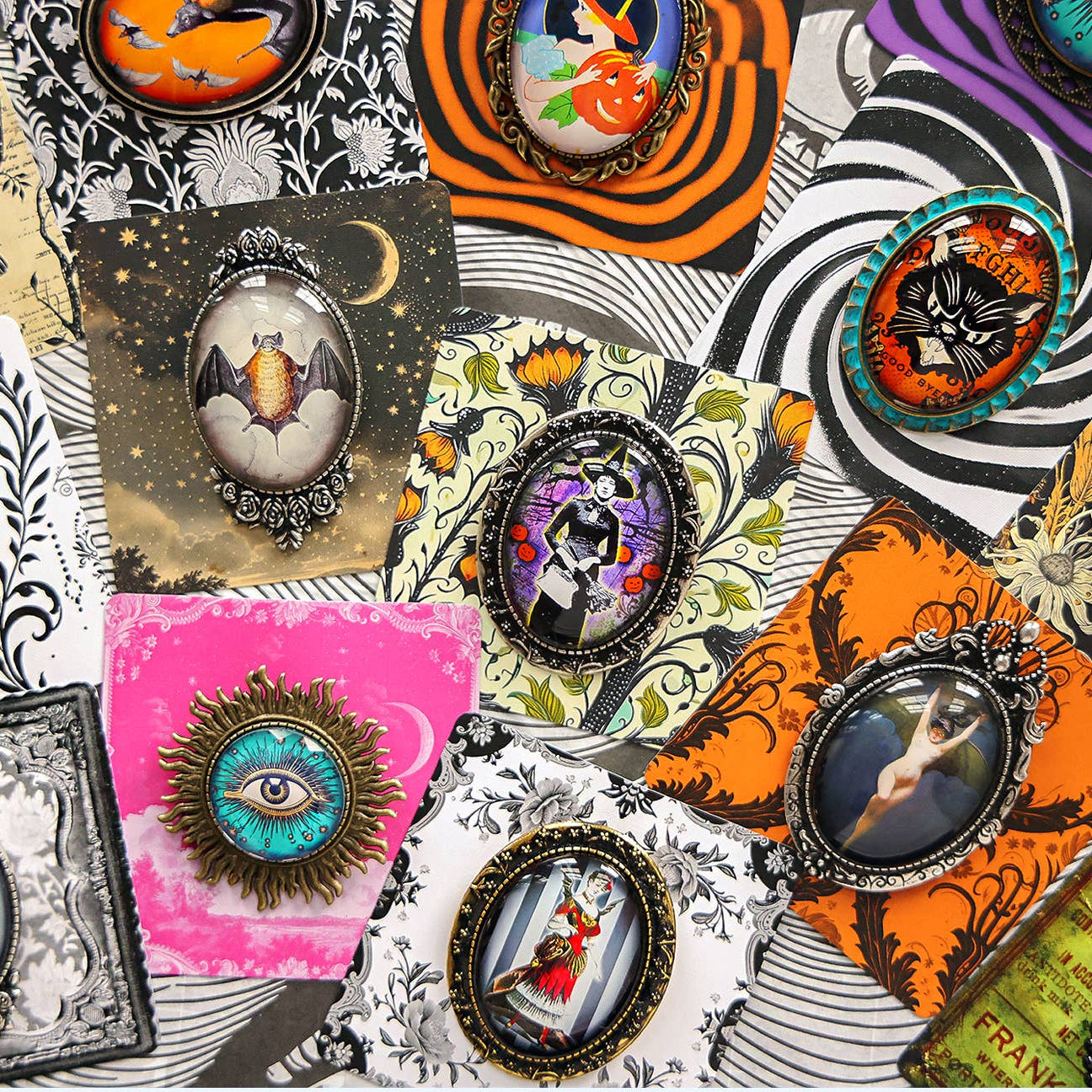 Each brooch is individually handmade in the artist’s studio, where glass cabochons are carefully created using imagery inspired by an extensive collection of vintage ephemera. Antique artwork and original designs are thoughtfully combined to create a distinctive, slightly macabre aesthetic.