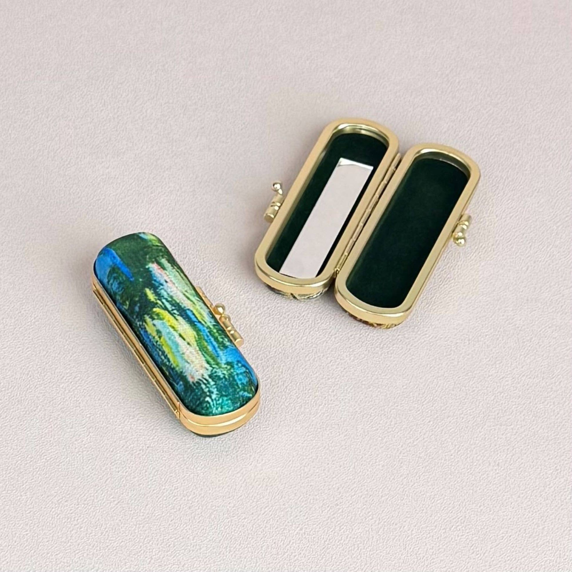 The serene, painterly design wraps the exterior in calming blues and greens, evoking the peaceful atmosphere of Monet’s beloved pond. A polished gold metal frame elevates the look with a touch of classic elegance. Inside, the case includes a built-in mirror and a snug compartment that fits a standard tube of lipstick, making it ideal for quick touch-ups wherever you go.