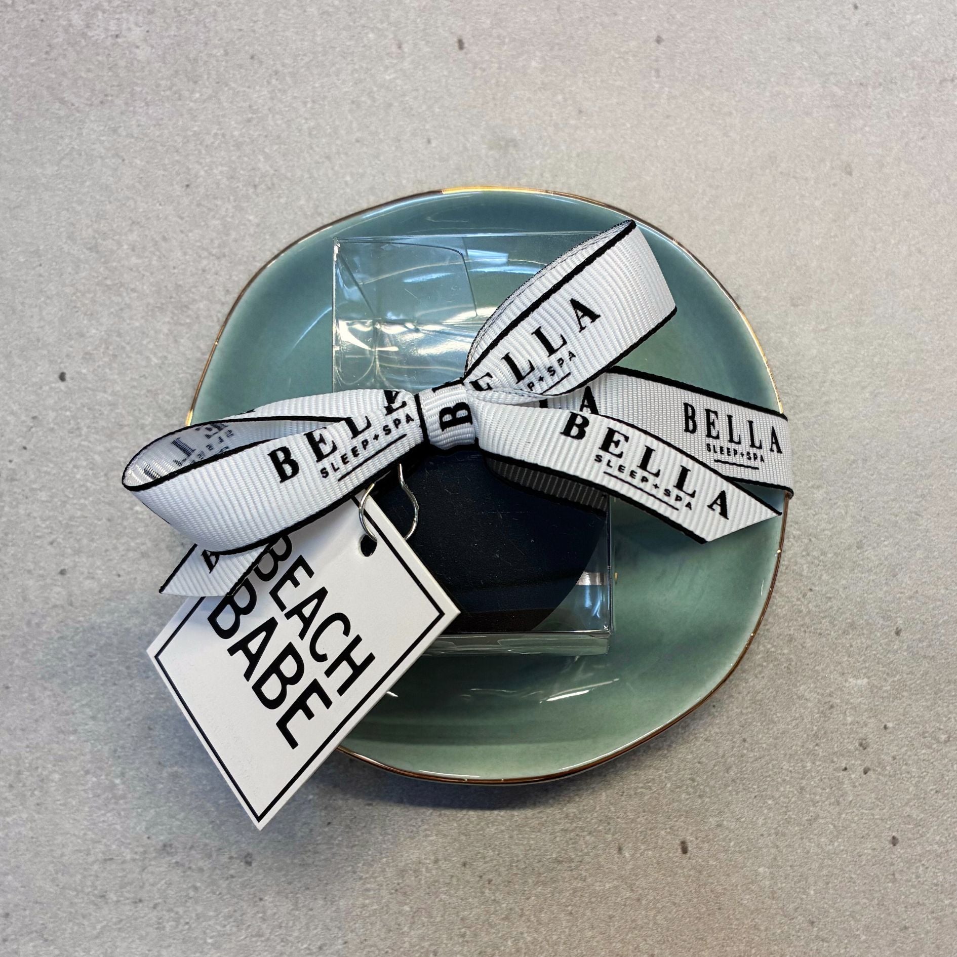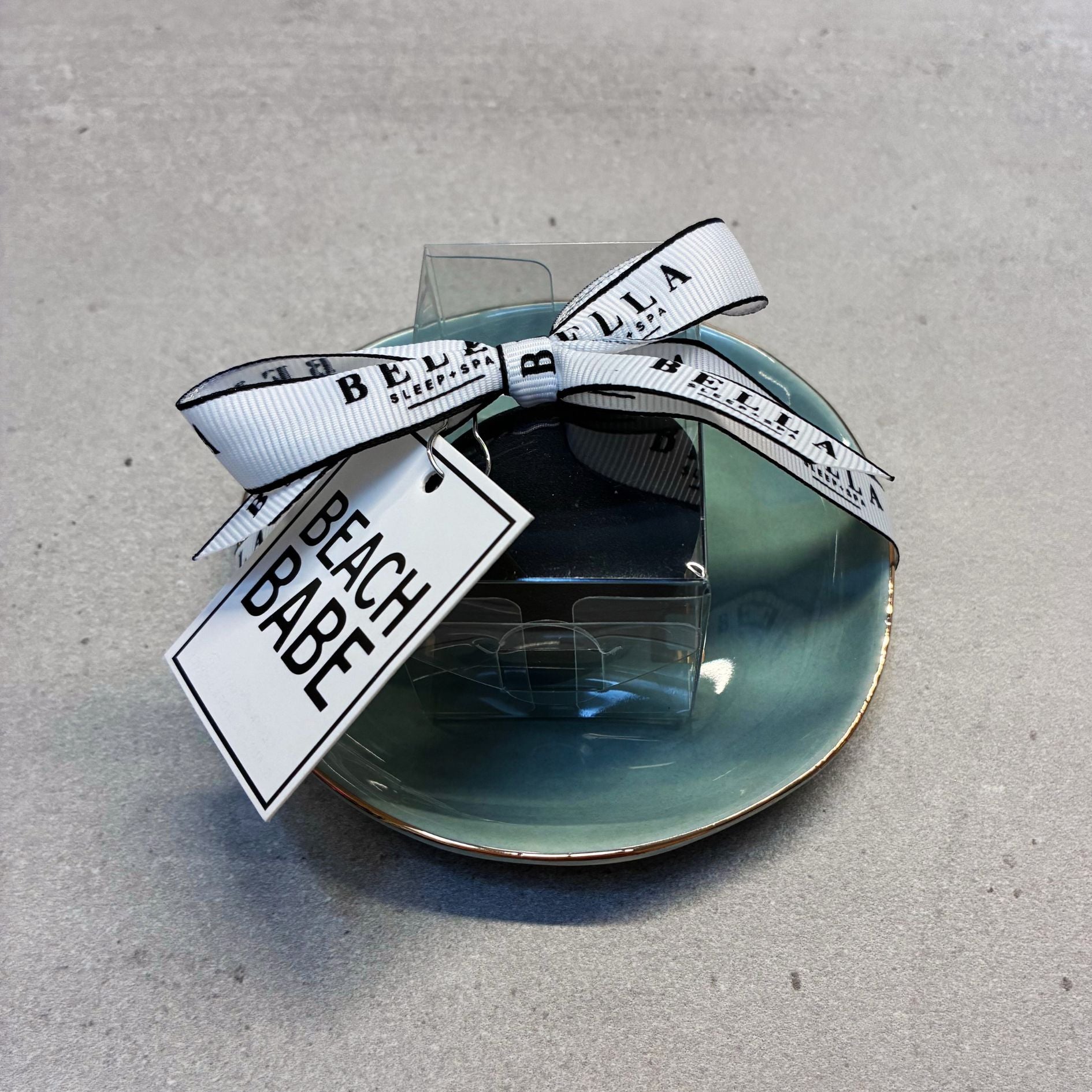- Ceramic tray reads: "Beach Babe" in gold print on sage green ceramic with a gold rim
