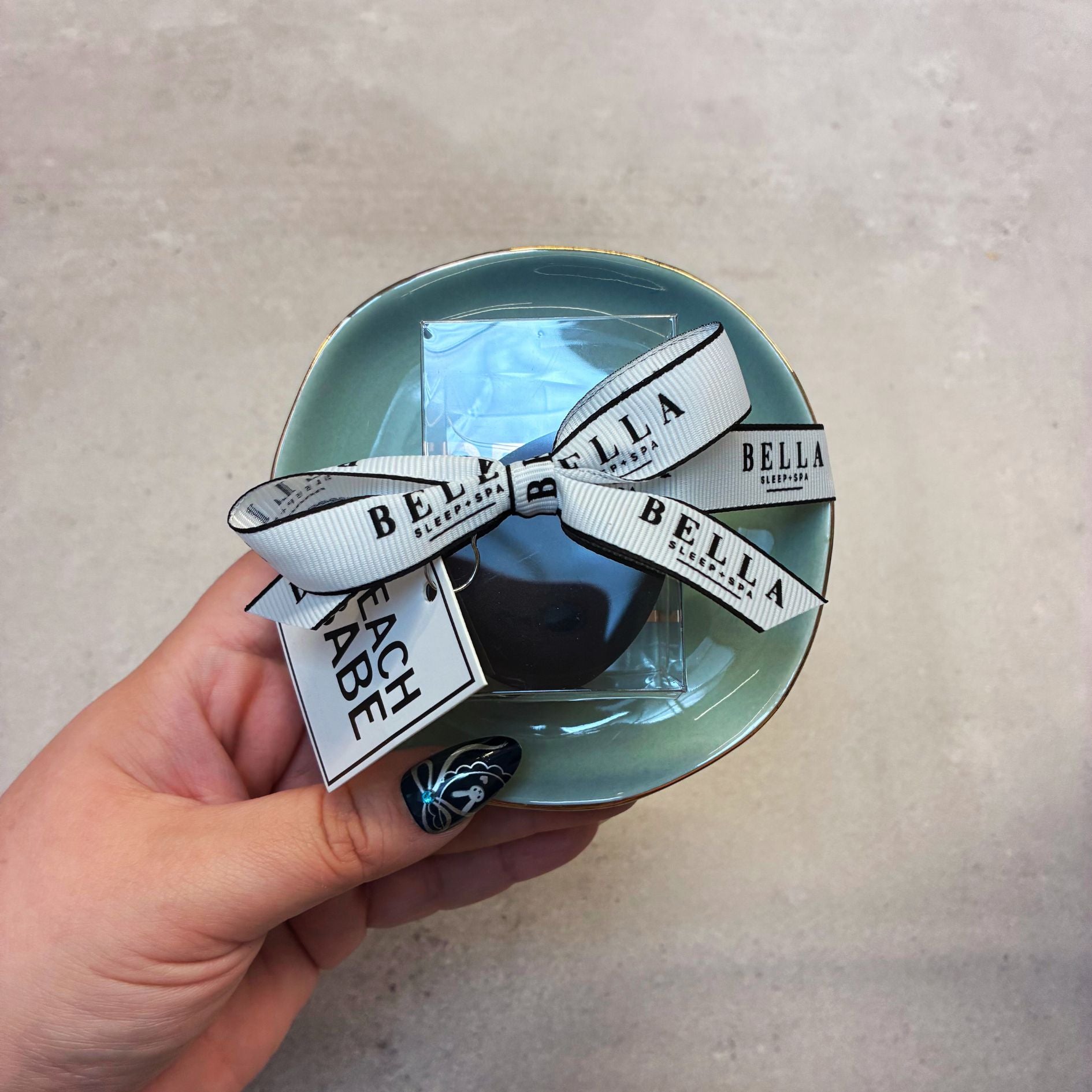 Elevate your makeup routine with the Beach Babe Sage Green Ceramic Tray and Black Sponge beauty blender set. This giftable beauty tools set is perfect for storing your sponge in style after smoothing on your makeup for a flawless finish. The ceramic tray features a charming "Beach Babe" design in gold print on sage green ceramic, complete with a gold rim for a touch of elegance. This set is a must-have for anyone looking to add a touch of luxury to their daily beauty routine or makes a thoughtful gift for the makeup lover in your life.