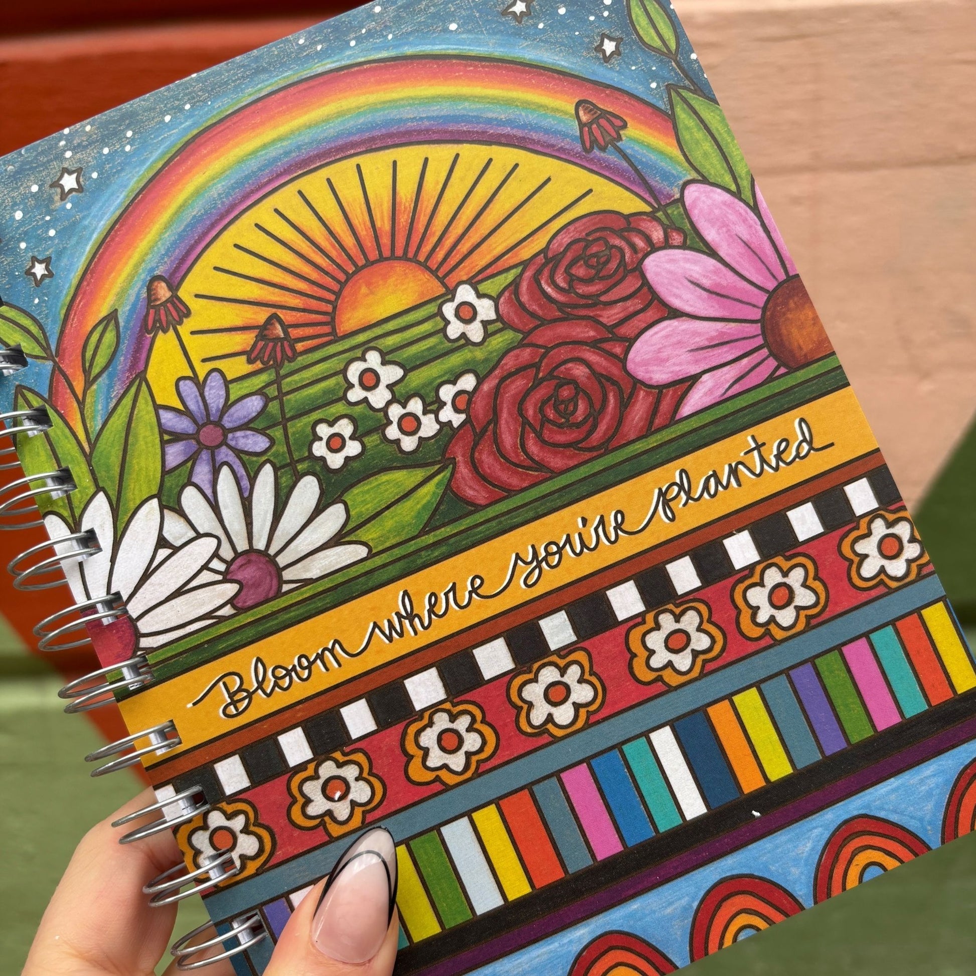 A double-sided spiral notebook featuring printed replications of colorful wood burned flowers and rainbow designs and a "Bloom Where You're Planted" sentiment. Bloom spiral notebook contains 120 lined pages.