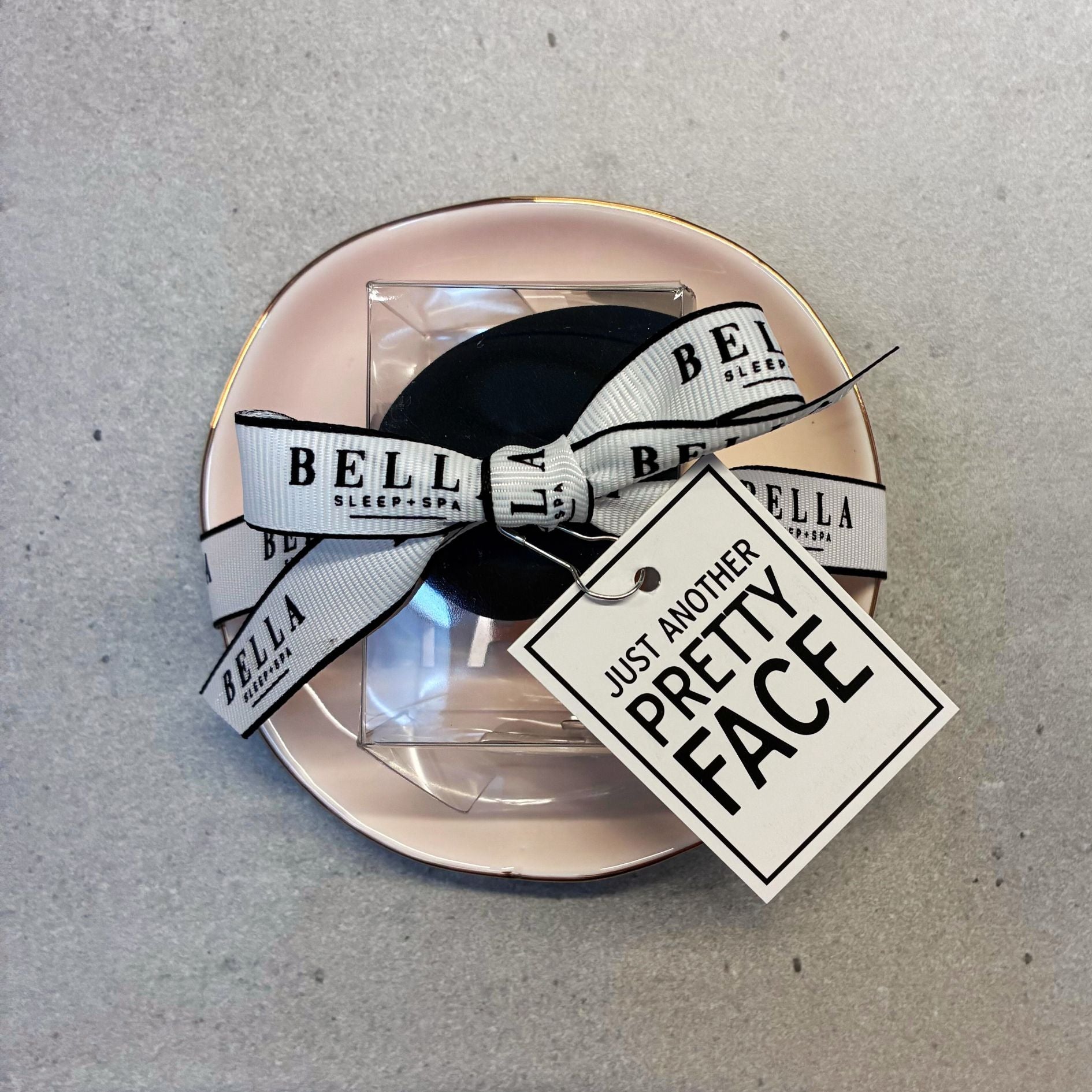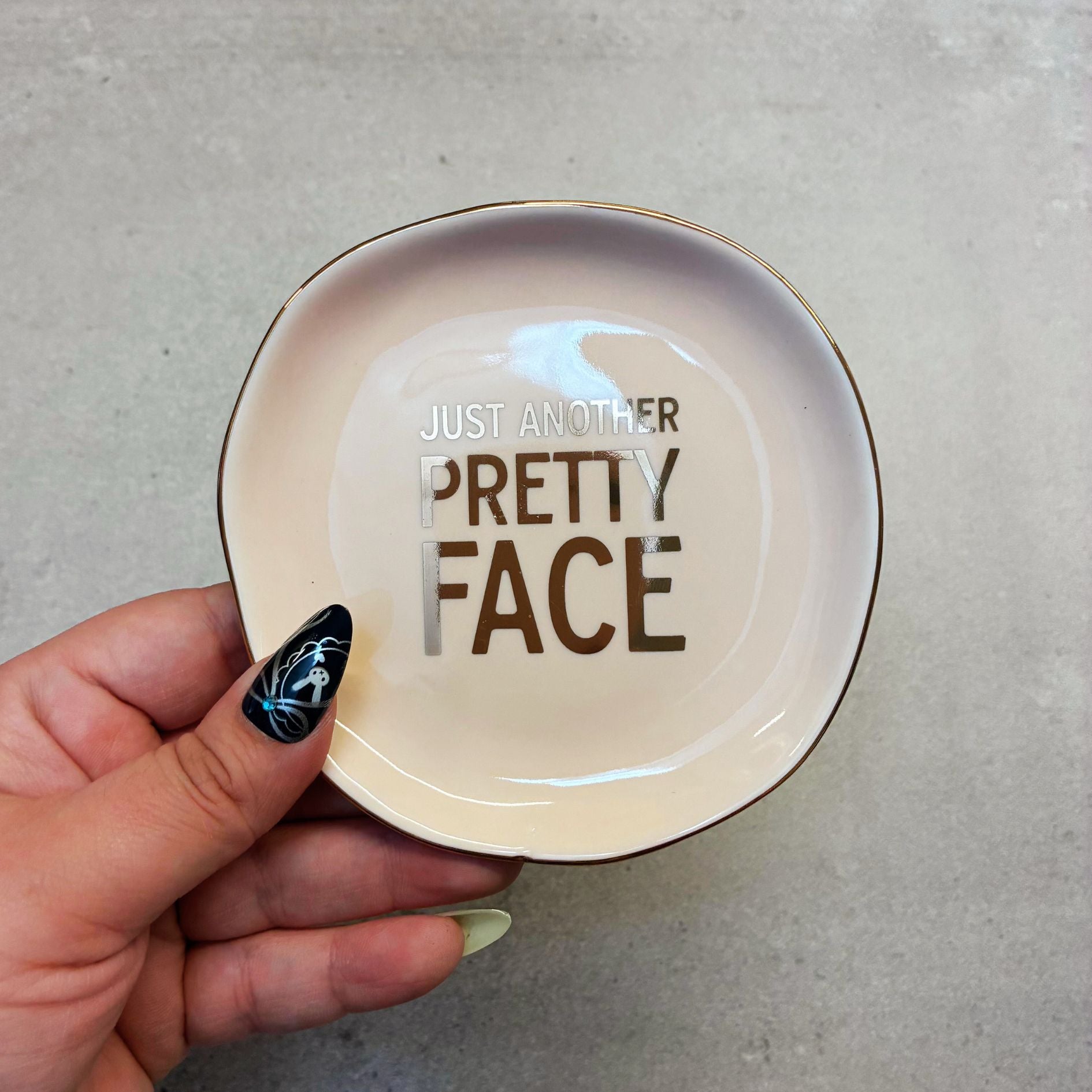 - Ceramic tray reads: "Just Another Pretty Face" in gold print on blush pink ceramic with a gold rim