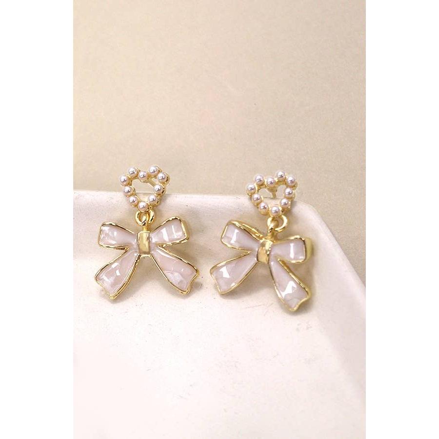 Coquette Bow Heart Pearl Drop Earrings in Gold PlatingLow stock: 2 left