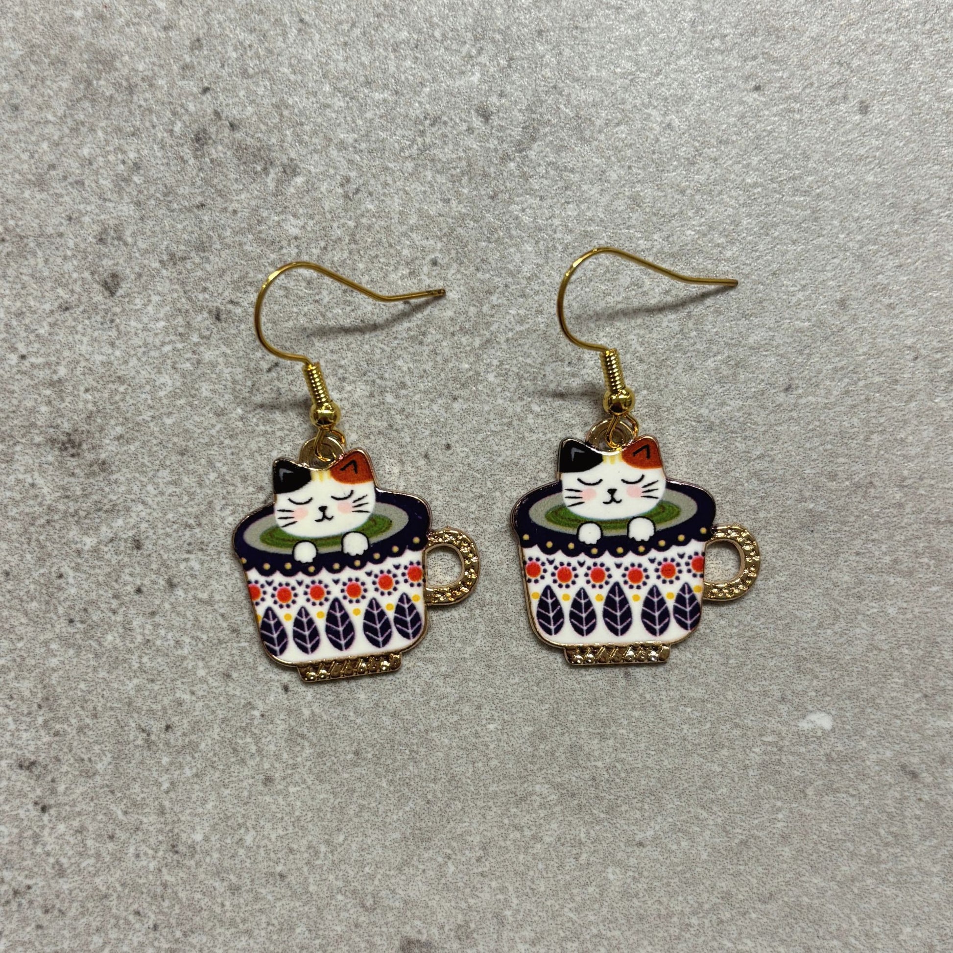 Cat in Blue Flora Coffee Cup Earrings | Cute Cat Lover Gift & Whimsical Coffee JewelryLow stock: 2 left
