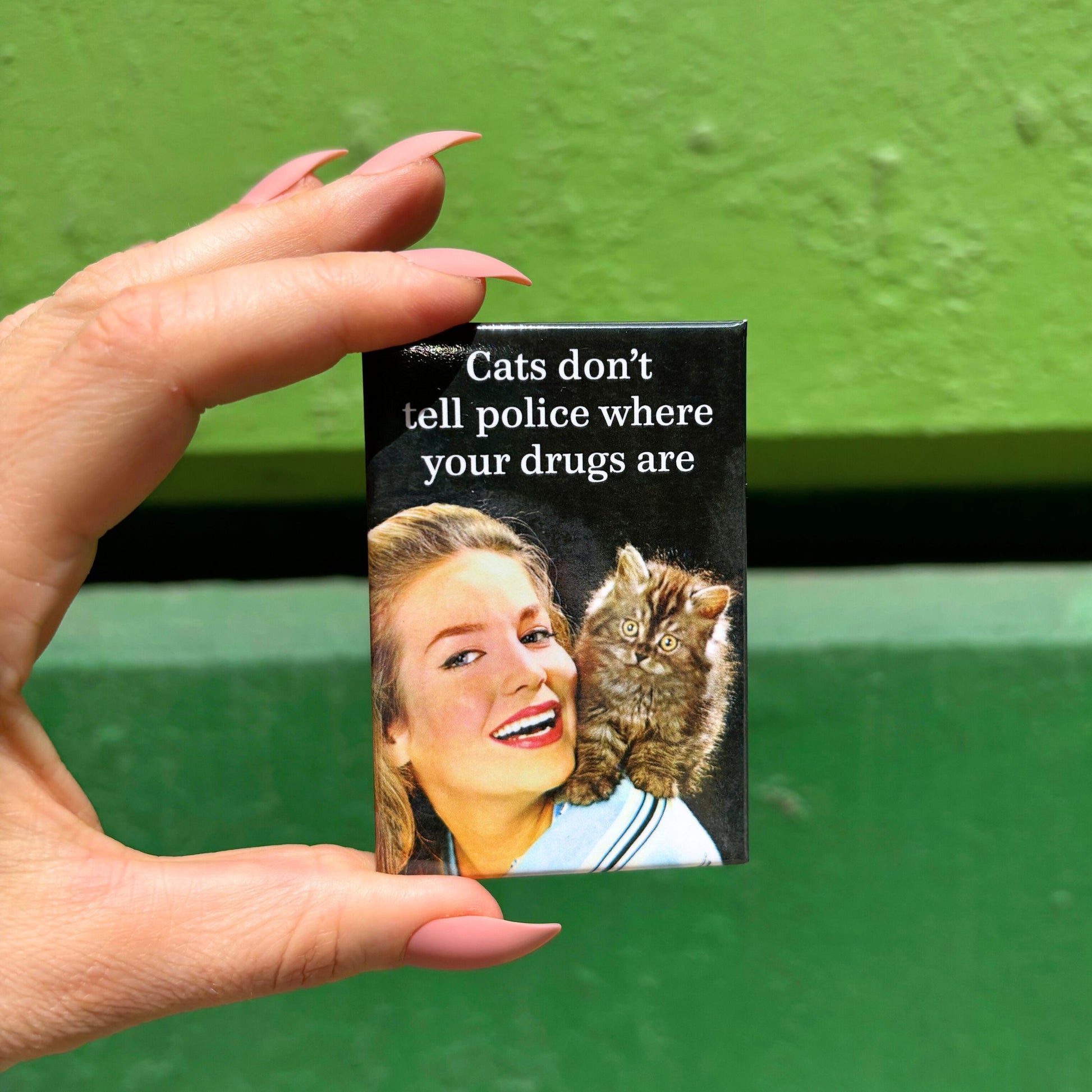 Rectangular magnet reads: "Cats don't tell police where your drugs are."