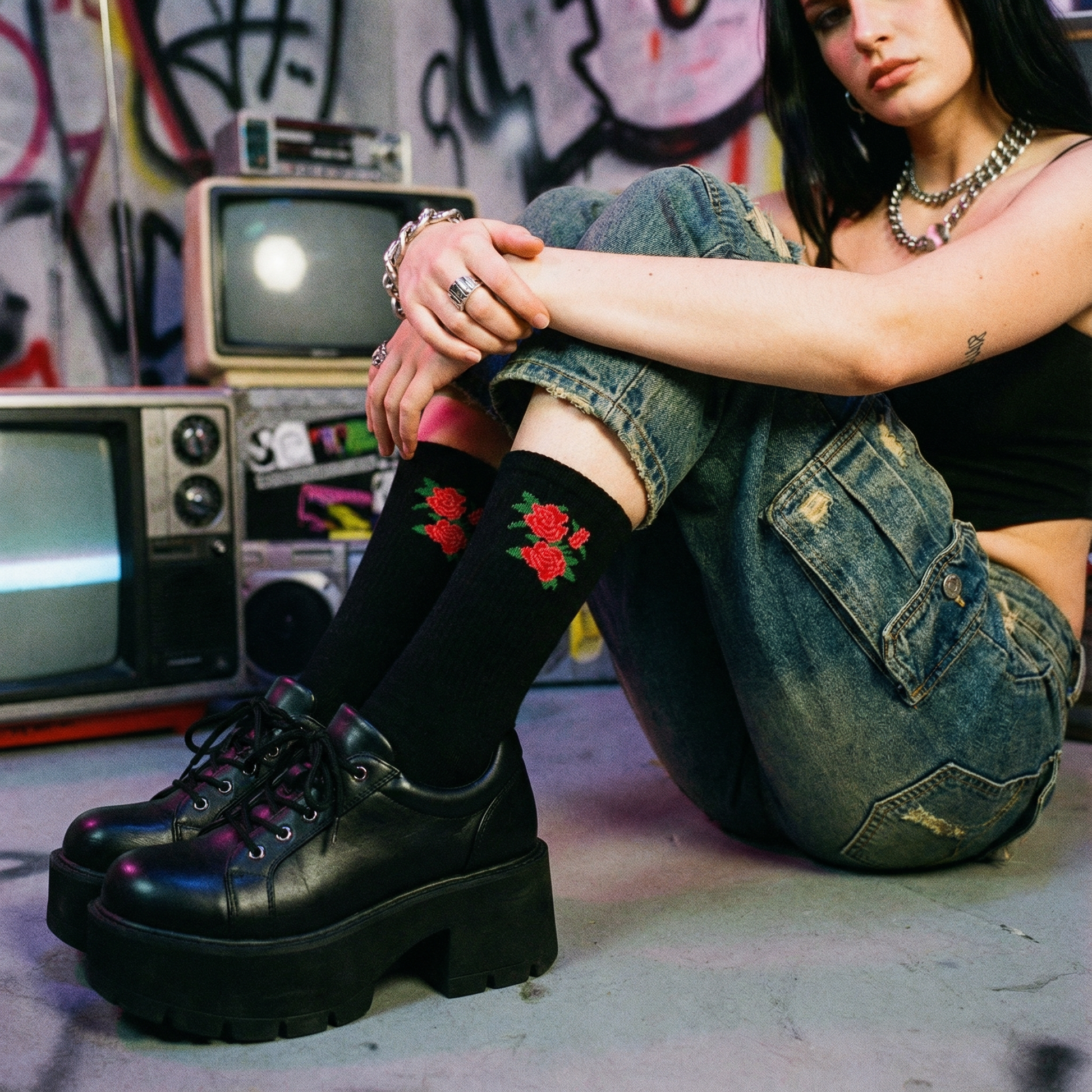 Red Roses Black Classic Crew Socks with Ribbed Tubing | Seamless Toe Seam Novelty SocksLow stock: 2 left
