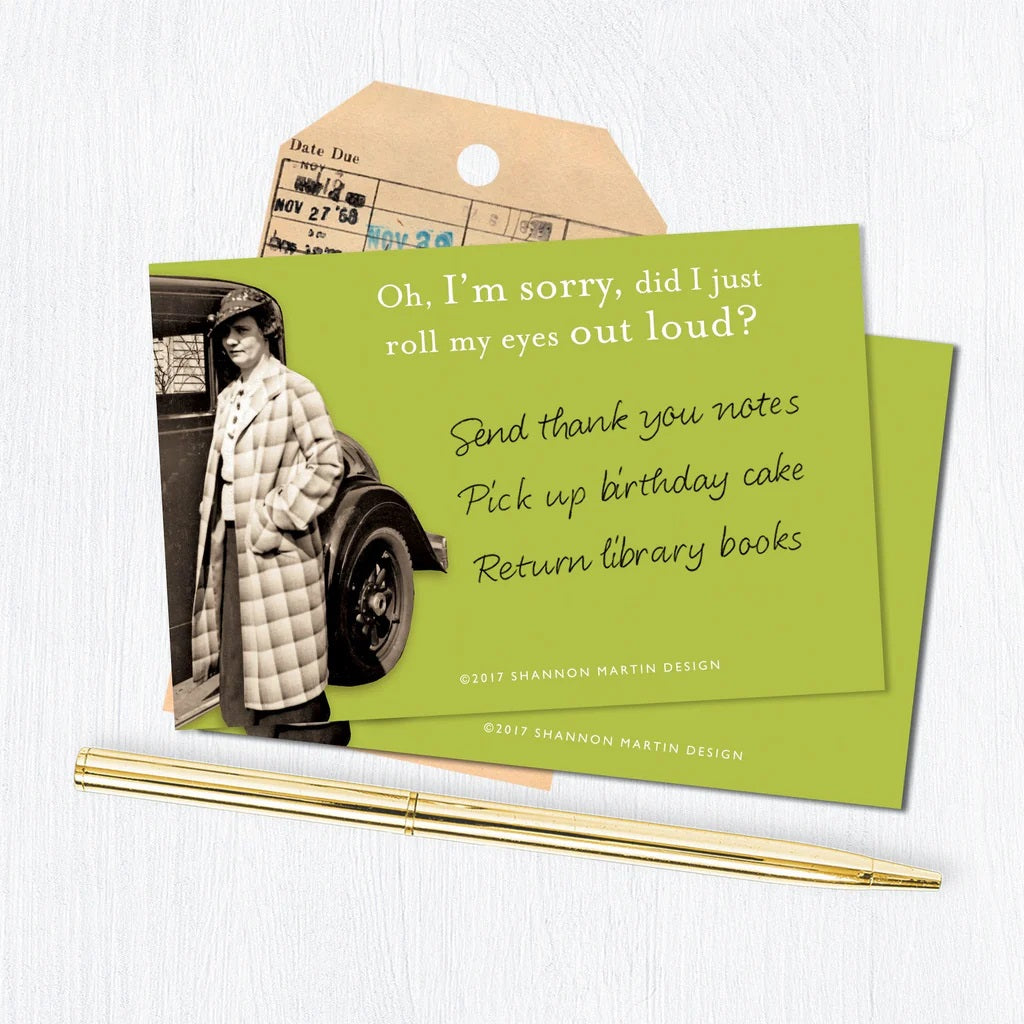 These green sticky notes by Shannon Martin Design feature a retro photograph paired with the message, "Oh, I'm sorry, did I just roll my eyes out loud?" With 75 sticky notes per pack, these 3.25" x 4.38" notes are great for lists, reminders, or leaving sweet and funny messages around the house. Made in the USA.