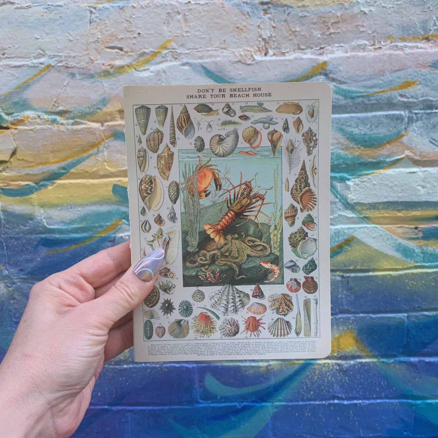 A vintage style double-sided journal features "Don't Be Shellfish Share Your Beach House" sentiment with various sea creature designs.