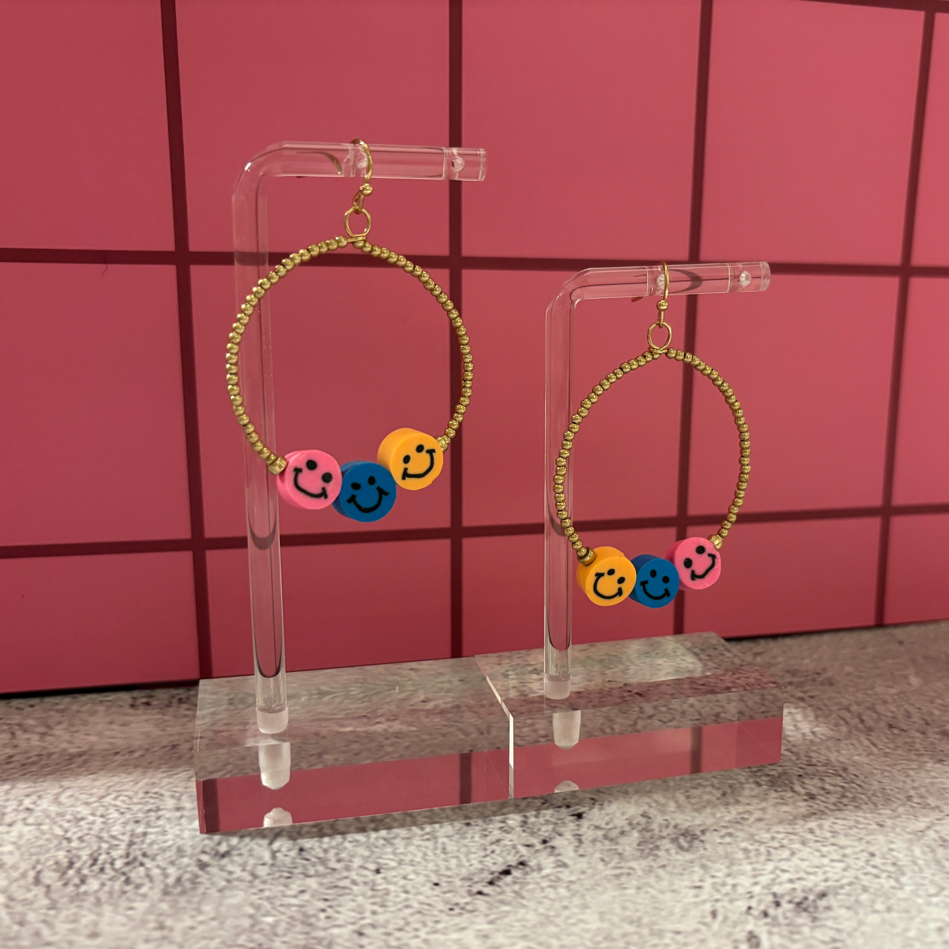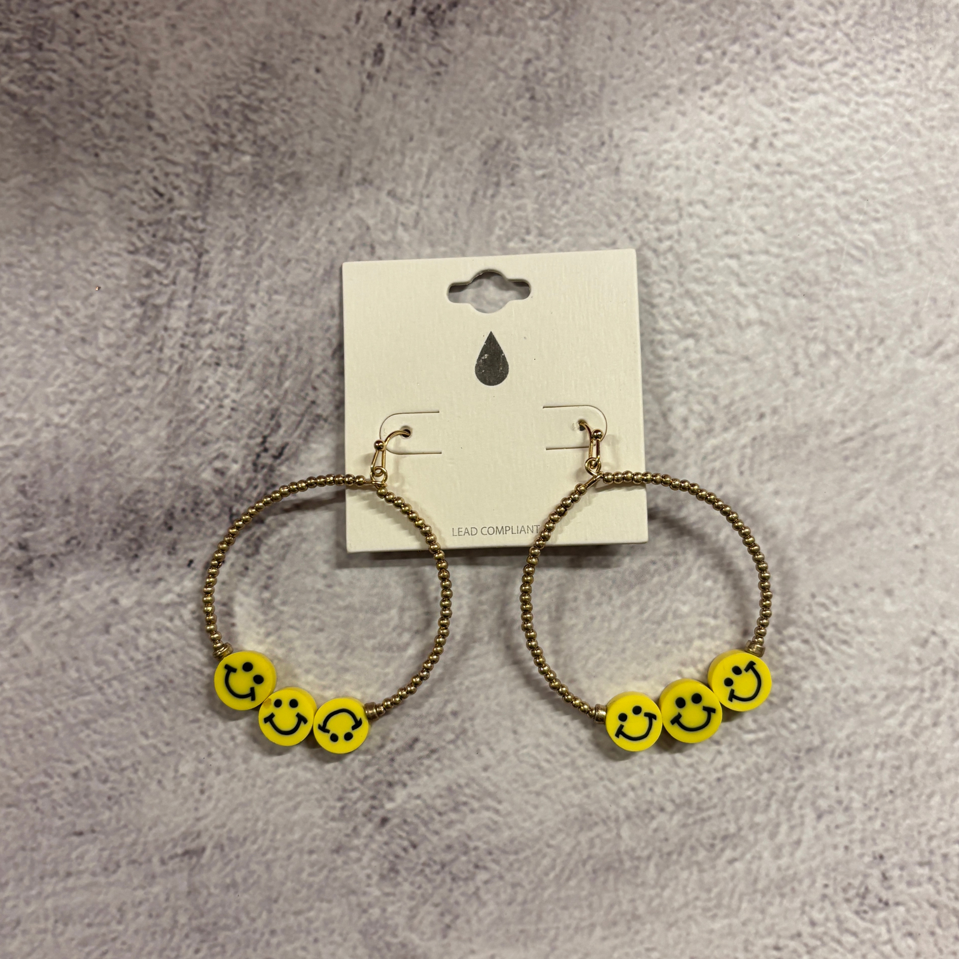 Add instant cheer to any outfit with these Smiley Face Hoop Earrings! Each pair features beaded gold-tone hoops adorned with bright smiley face beads that bring playful, feel-good energy to your look.