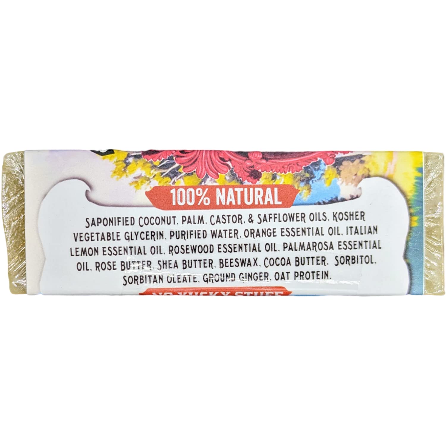 - Ingredients: Saponified Coconut, Palm, Castor, & Safflower oils, Kosher Vegetable Glycerin, Purified Water, Orange Essential oil, Italian Lemon Essential oil, Rosewood Essential Oil, Palmarosa Essential Oil, Rose Butter, Shea Butter, Beeswax, Cocoa Butter, Sorbitol, Sorbitan oleate, Ground Ginger, Oat protein.