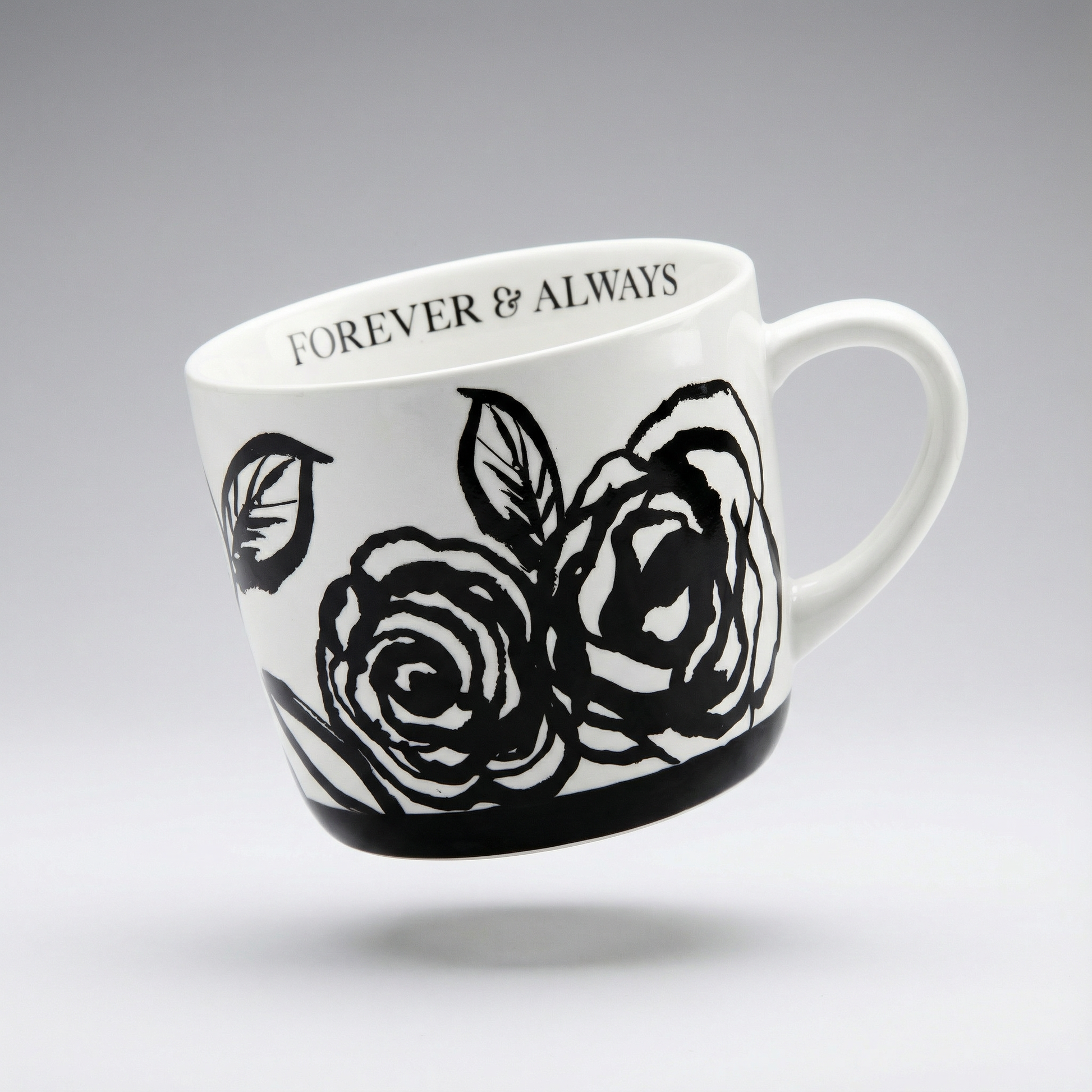 Forever & Always Mug in White with Black Floral Artwork | Giftable Coffee Tea Cup | 15oz