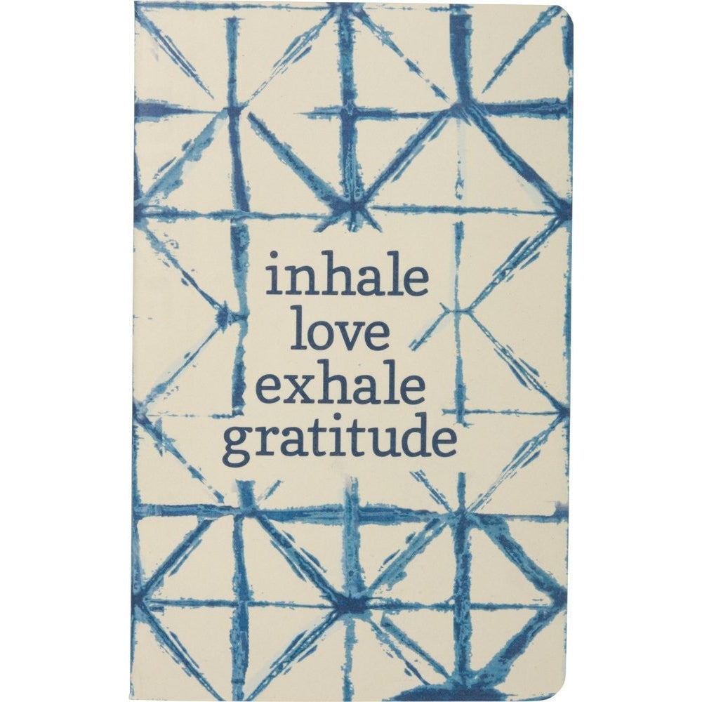 Indigo dyes through the use of shibori give way to this set of two double-sided notebooks, featuring one "Good Vibes" sentiment notebook and one "Inhale Love - Exhale Gratitude" sentiment notebook, both with patterned designs and inside back slip pocket. Complements well with coordinating styles for a cohesive collection. One notebook contains 80 lined tear-away pages, and one contains 80 unlined pages.