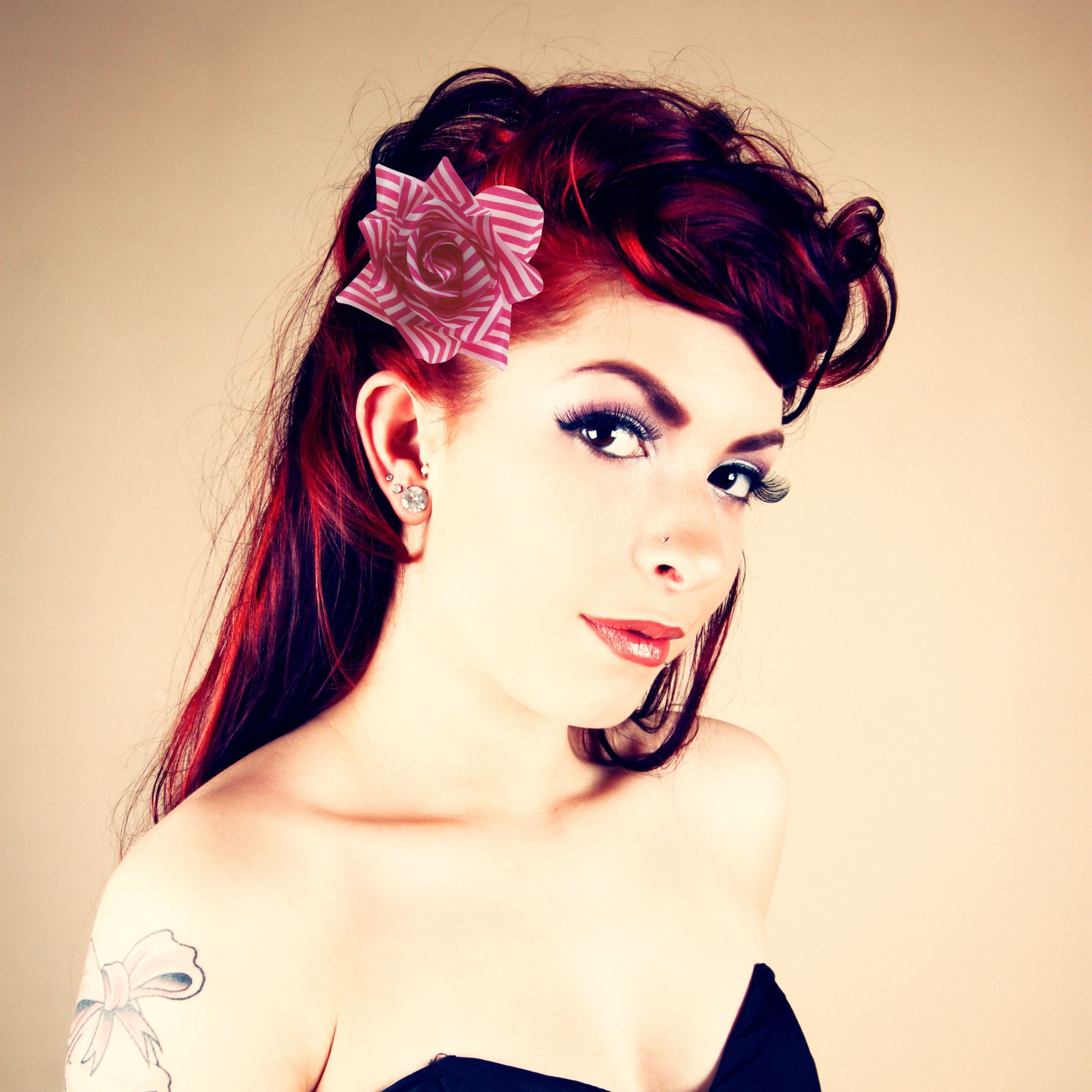 Pink & White Striped Rose Hair Clip | Retro Floral Hair AccessoryLow stock: 8 left