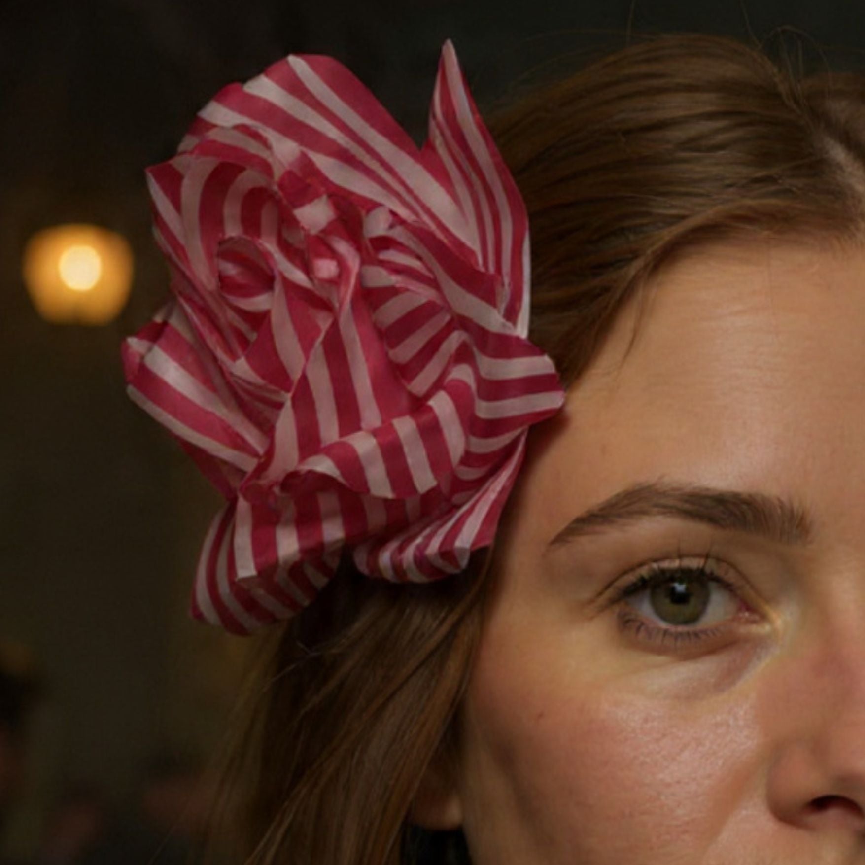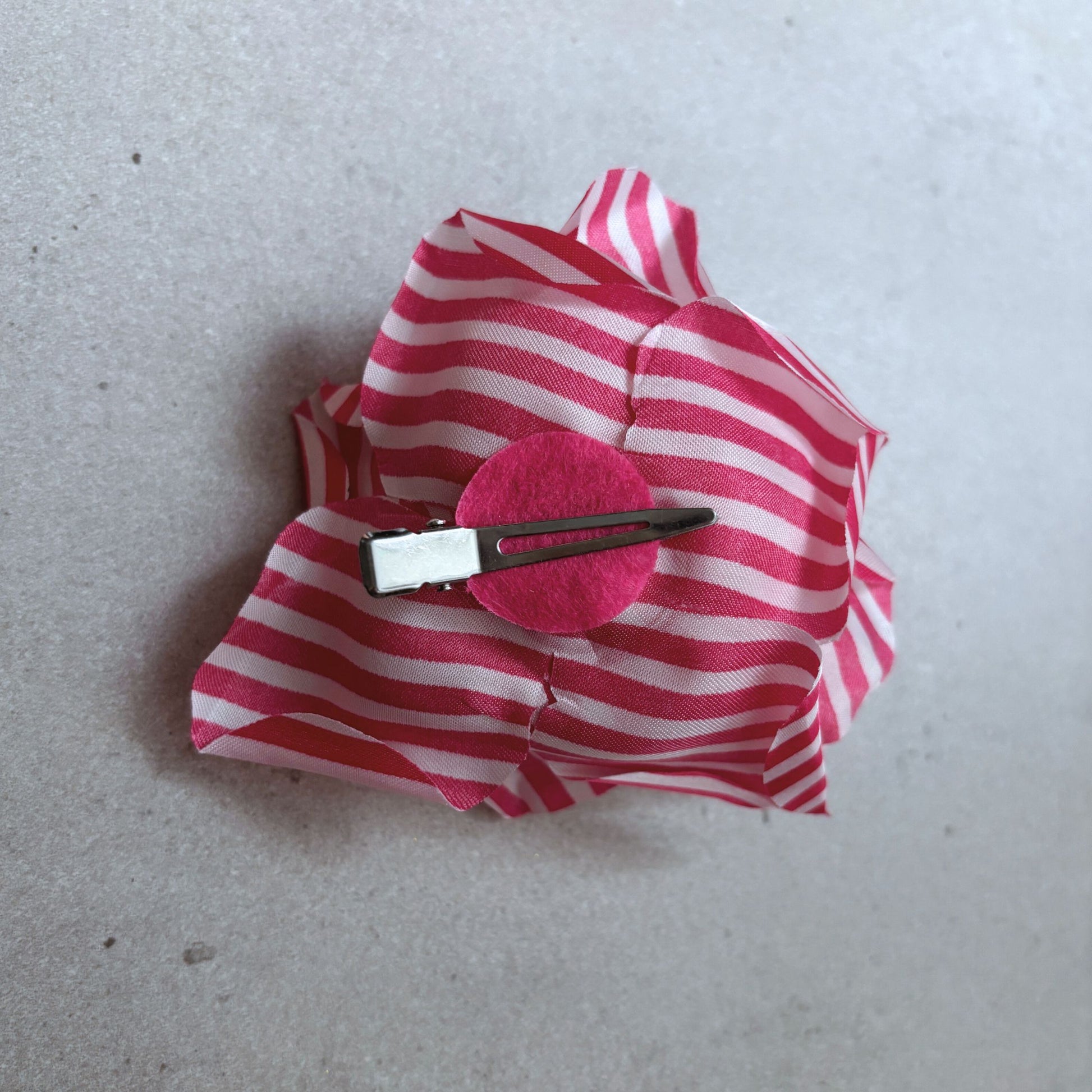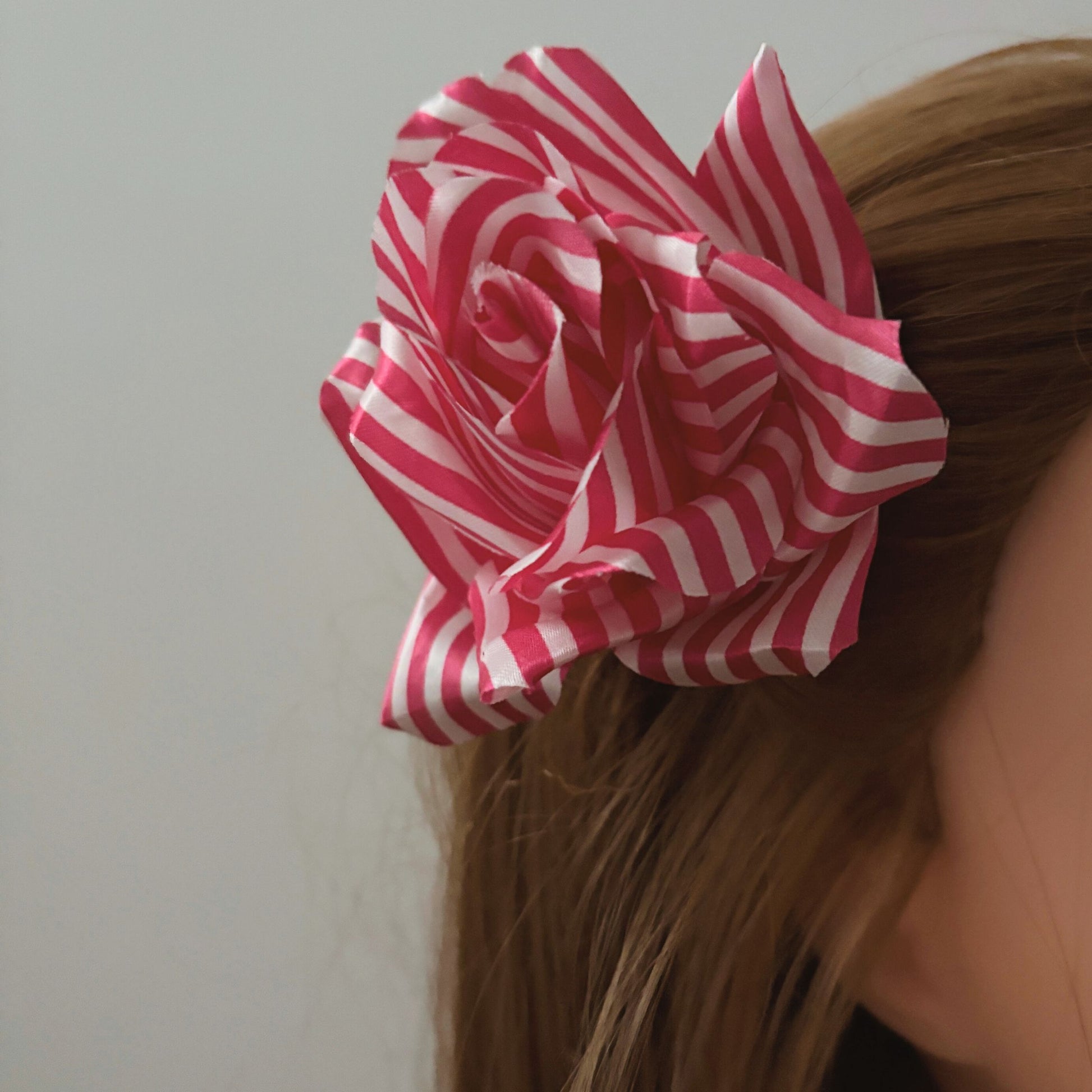 Add a fun retro twist to your look with the Pink & White Striped Rose Hair Clip! 🌸