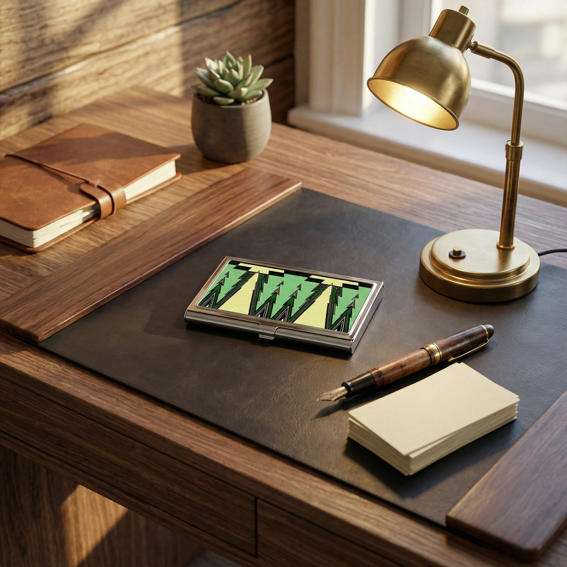 This Art Deco business card case with a swanky design was adapted from an original 1920's era black and white image, and brought to life with a classic deco color scheme of pale green, chartreuse, black and a hint of mauve. Your friends will be green with envy when you flash this eye-popping business card holder at your next meeting.