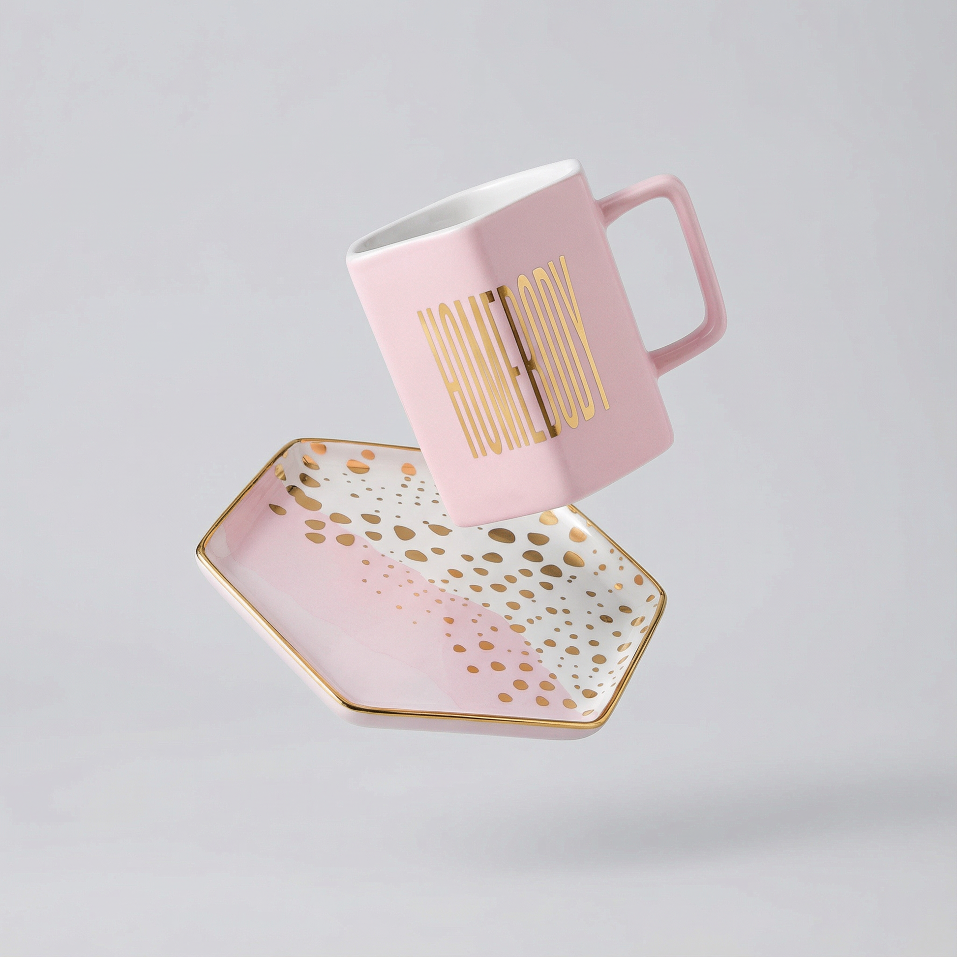 Sip your morning coffee or evening tea in style with the Homebody Hexagon Mug and Saucer Set, featuring a chic gold dot pattern and "Homebody" in gold lettering on the pink ceramic. Perfect for birthdays, holidays, special events, or just because, this ceramic set with a gold accented handle and rim makes a thoughtful gift for friends and family.
