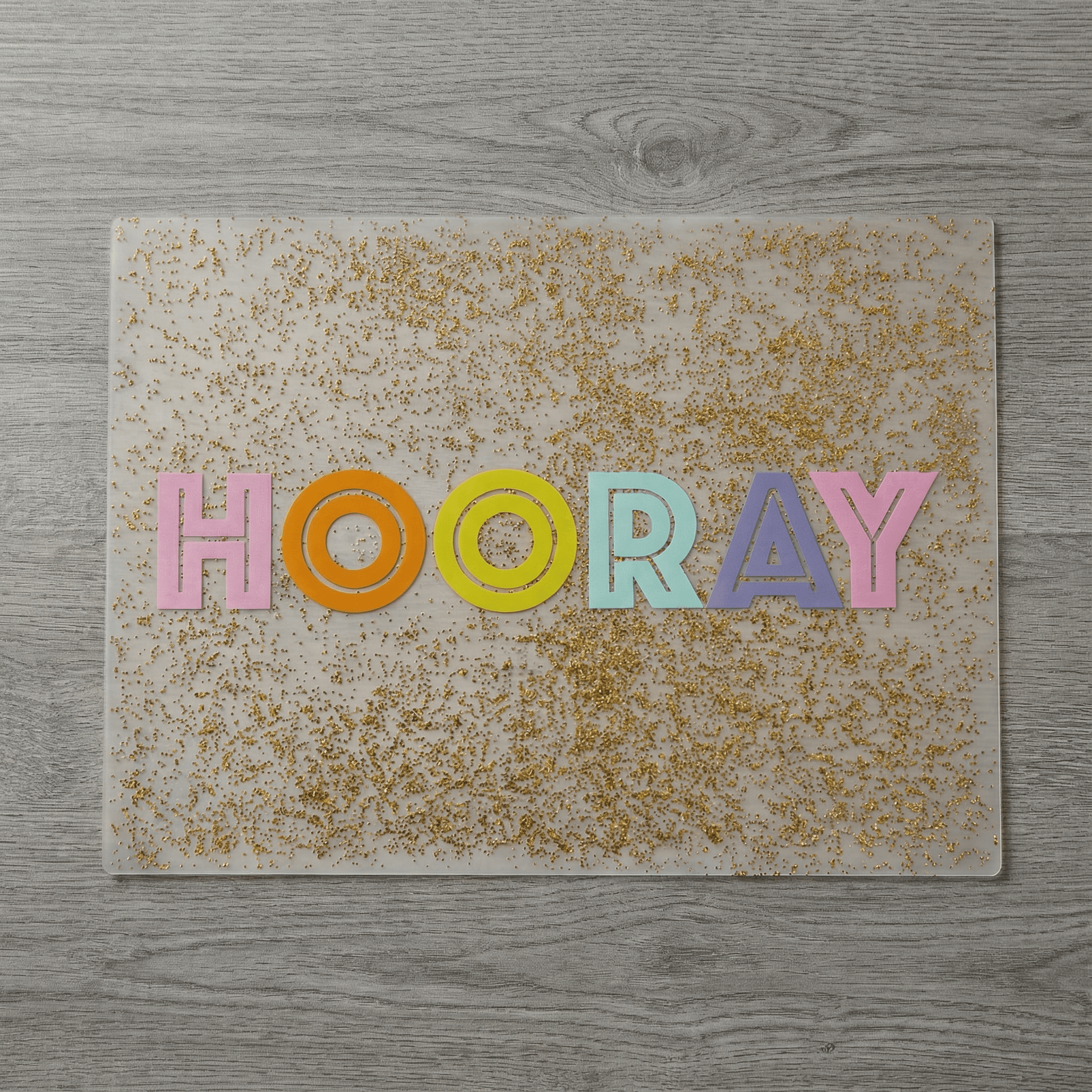 - FUN GLITTER DESIGN; reads "Hooray" in fun, multicolored text