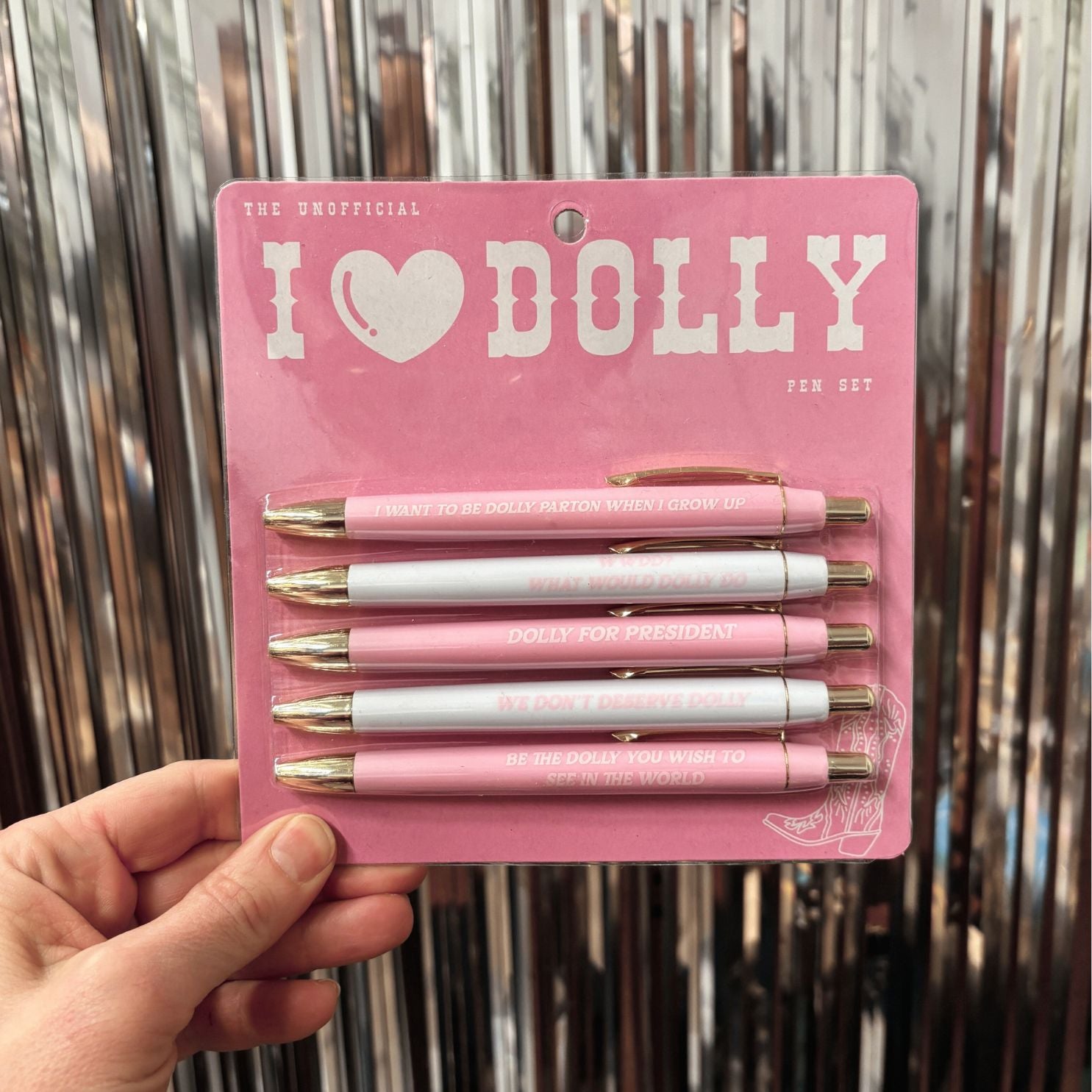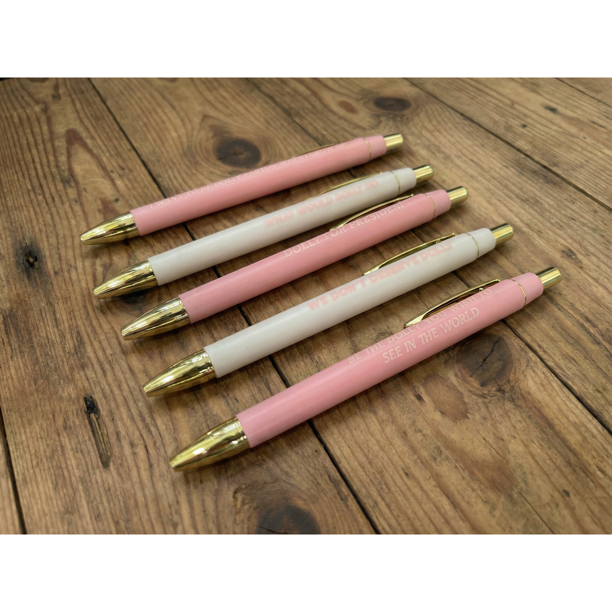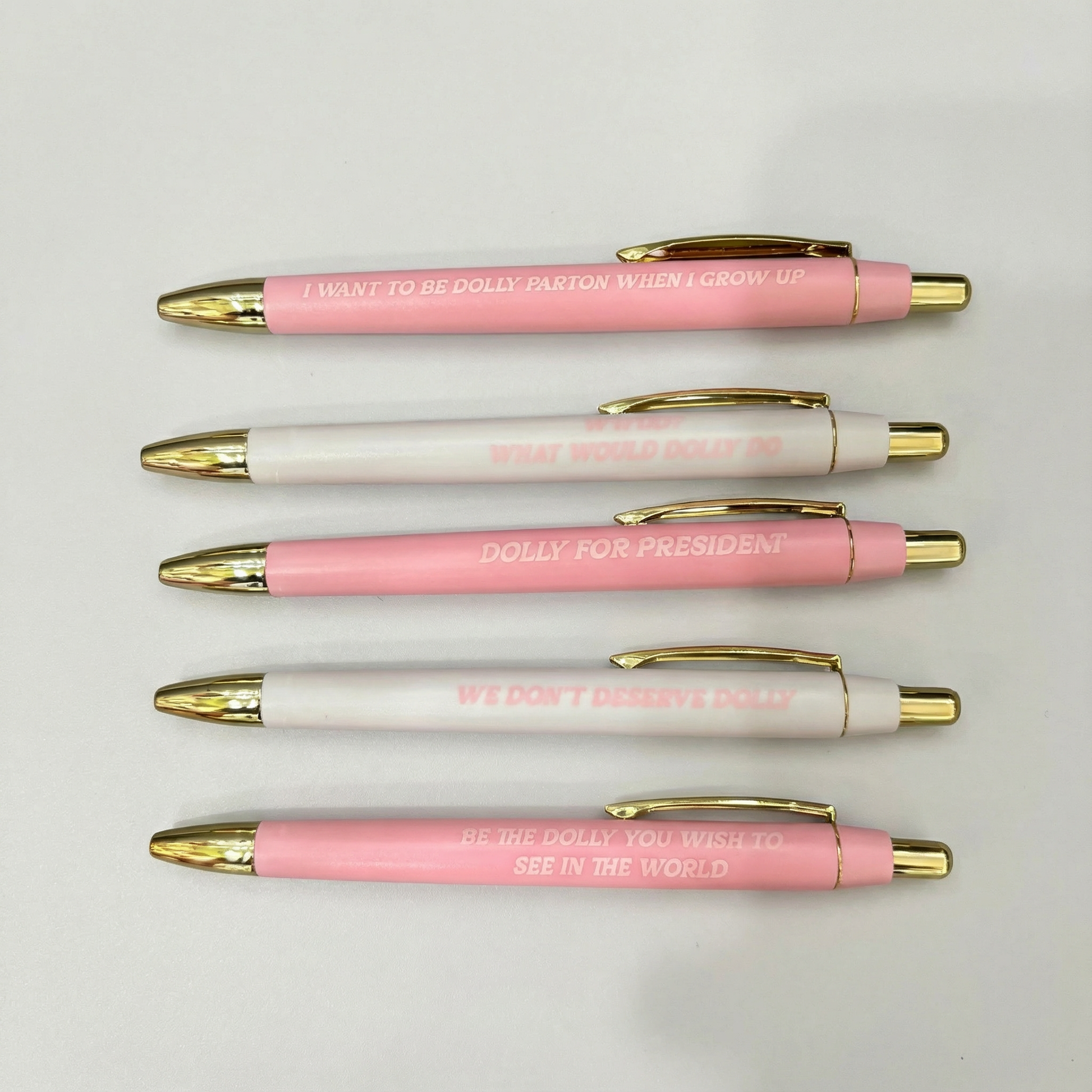 Each set includes five smooth-writing black ink ballpoint pens, each printed with a playful, empowering message inspired by the one and only Dolly. Whether you’re jotting notes, manifesting dreams, or gifting a fellow fan, these pens add charm, humor, and unmistakable Dolly energy to everyday writing.