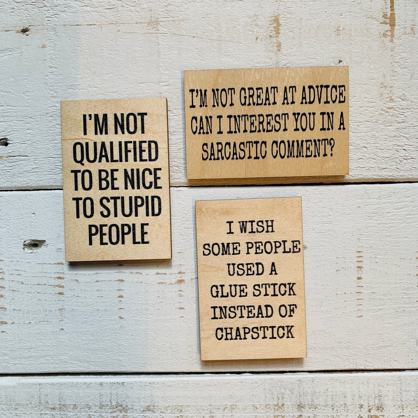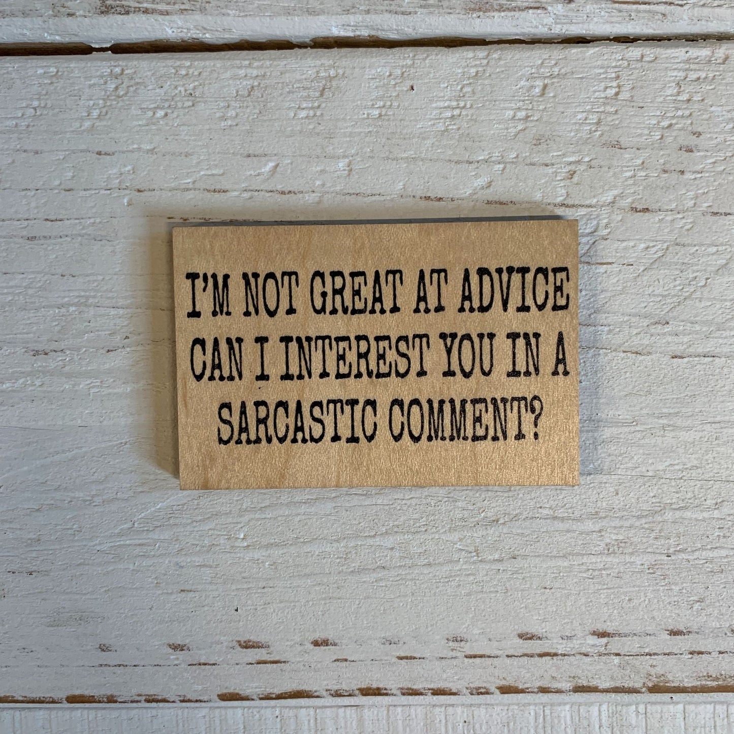 Funny wood refrigerator magnet with "I'm Not Great At Advice Can I Interest You In A Sarcastic Comment"