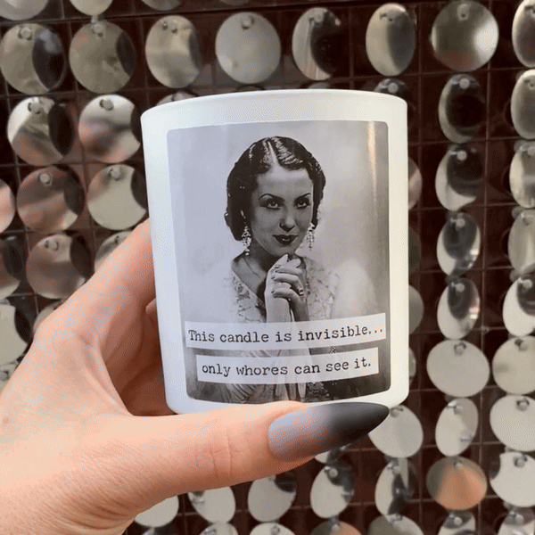 Brighten up any room with the Whores Candle, featuring a vintage photograph double-sided design and a soothing lavender jasmine scent. This unique jar candle is a hilarious home accent that makes a great gift for those with a sense of humor. Handcrafted with soy wax and a cotton wick, this candle has a long burn time of up to 35 hours. The frosted white glass and included dust cover and plastic lid add a touch of elegance to this 8 oz. candle, making it a perfect gift for any occasion.