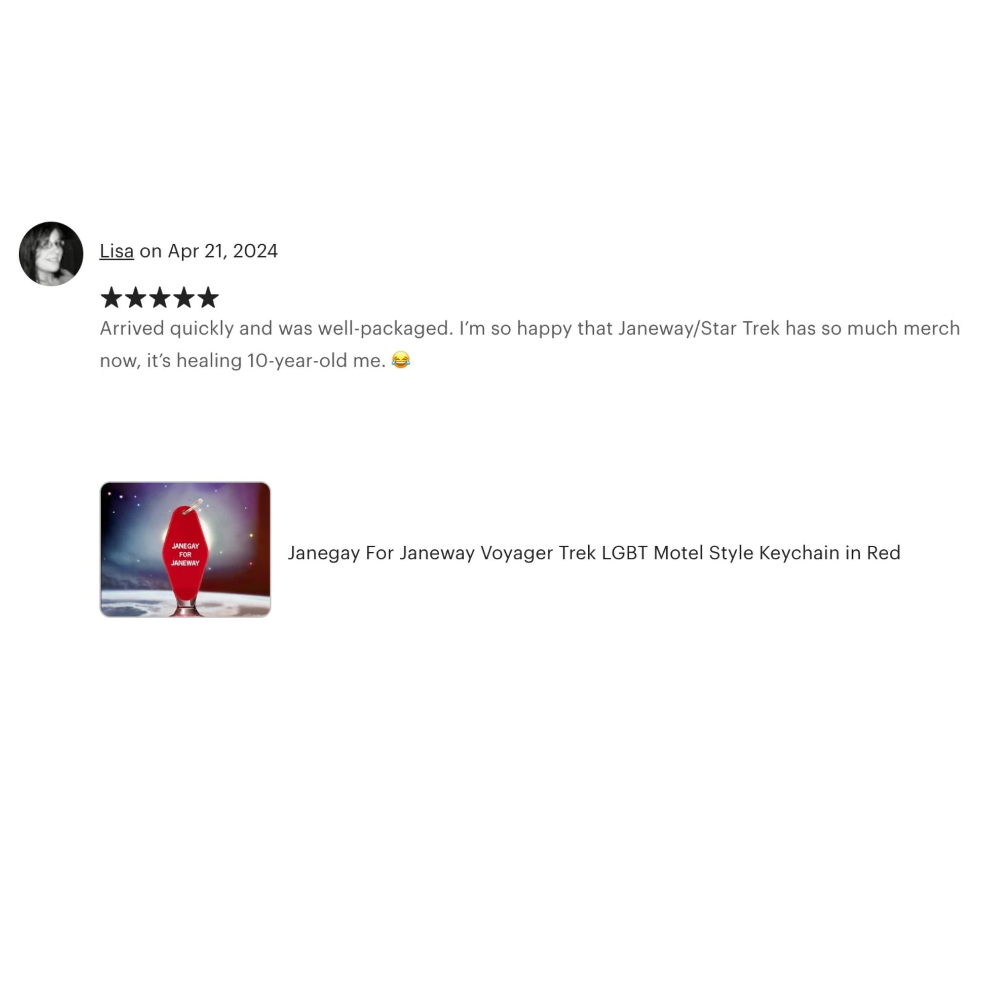 This keychain reads: JANEGAY FOR JANEWAY in white lettering. The perfect keychain for Star Trek: Voyager fans who were shipping themselves with the captain. Remember her in that white suit? Whew! We do.