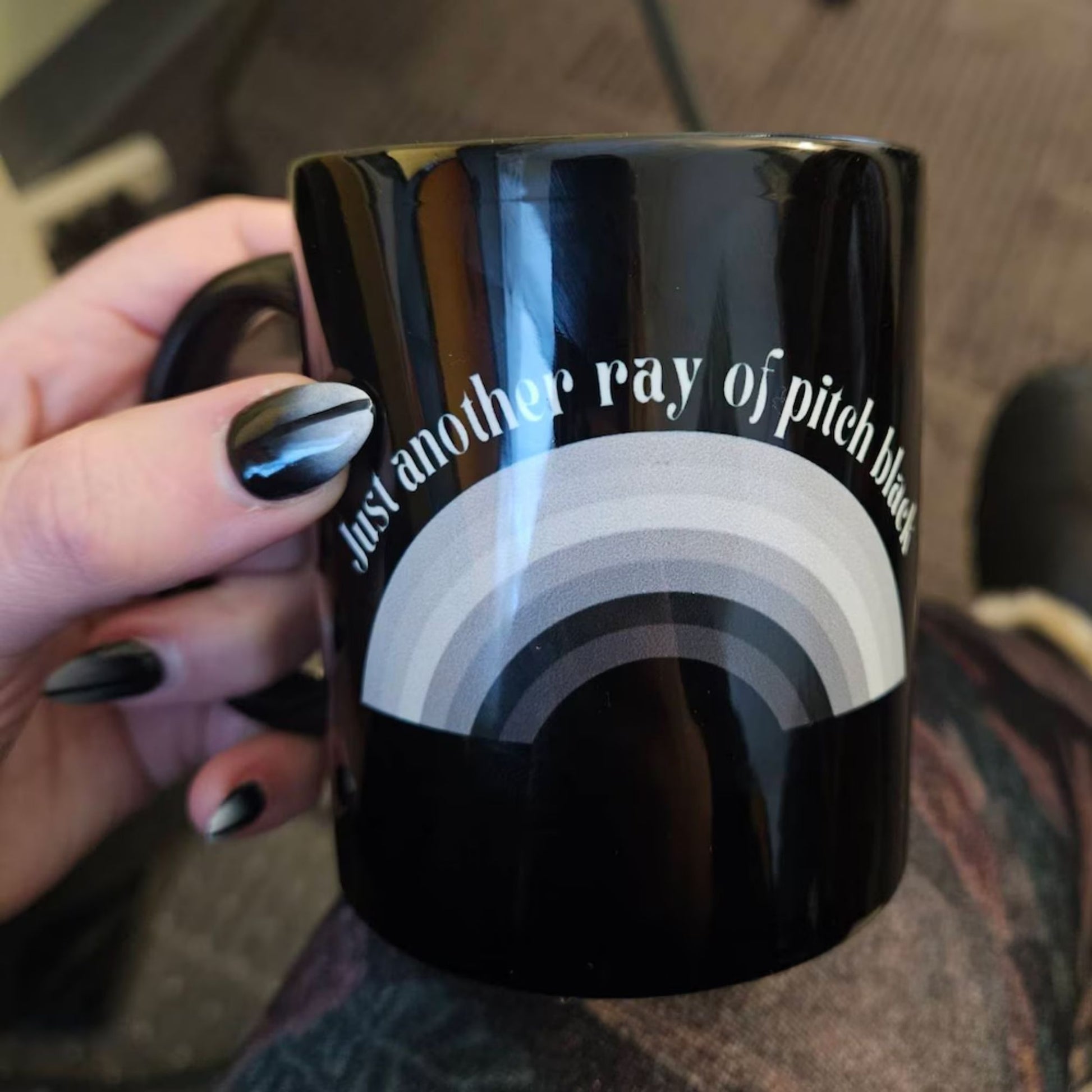 Indulge in your morning coffee ritual with the Just Another Ray of Pitch Black 11oz Black Mug, featuring a gothic monotone rainbow design on both sides. This BPA and lead-free ceramic mug is microwave and dishwasher-safe, making it a practical and stylish gift for the coffee, tea, or hot chocolate lover in your life.