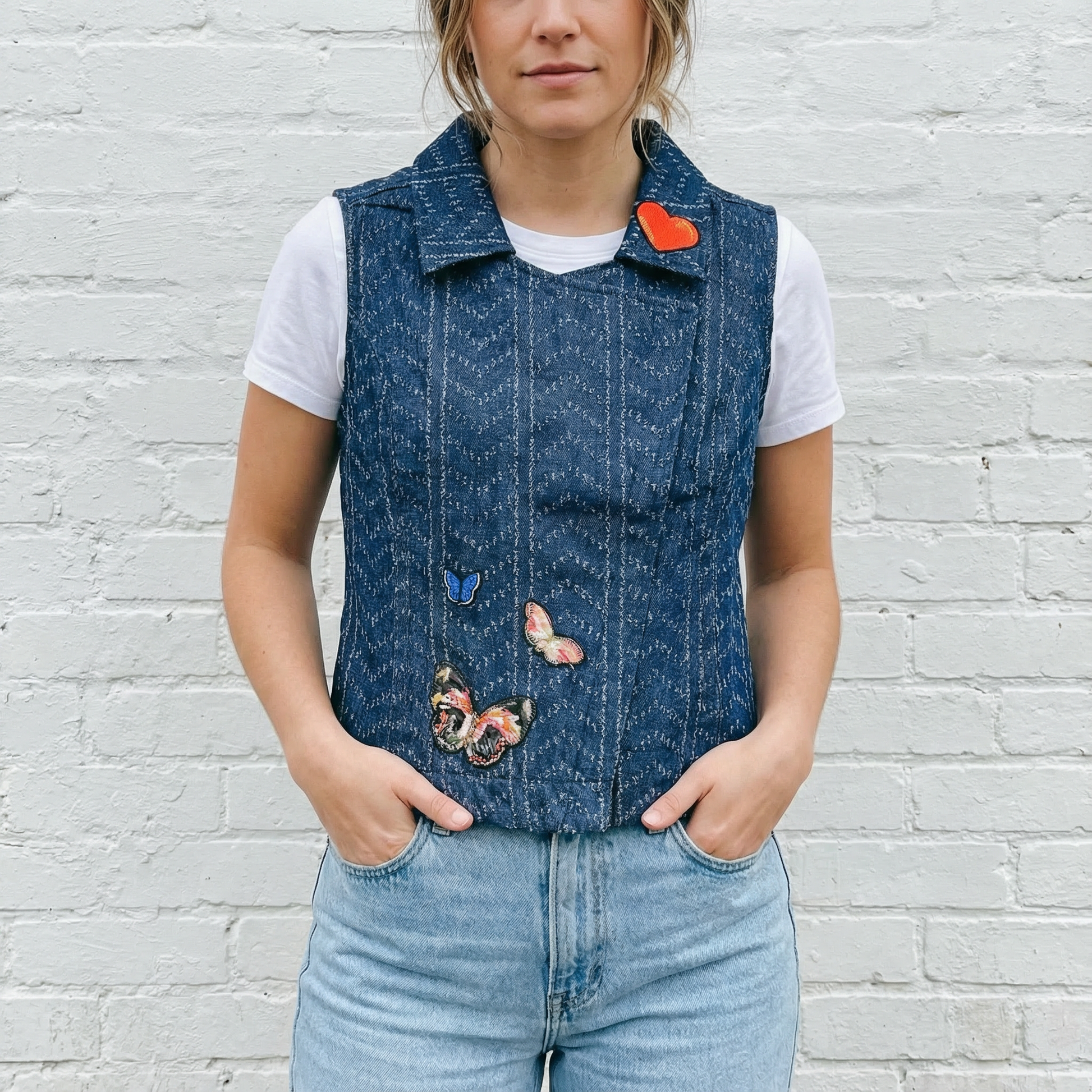 Textured denim vest features a modern, asymmetrical zipper, lapels, and eye-catching embroidered patches.