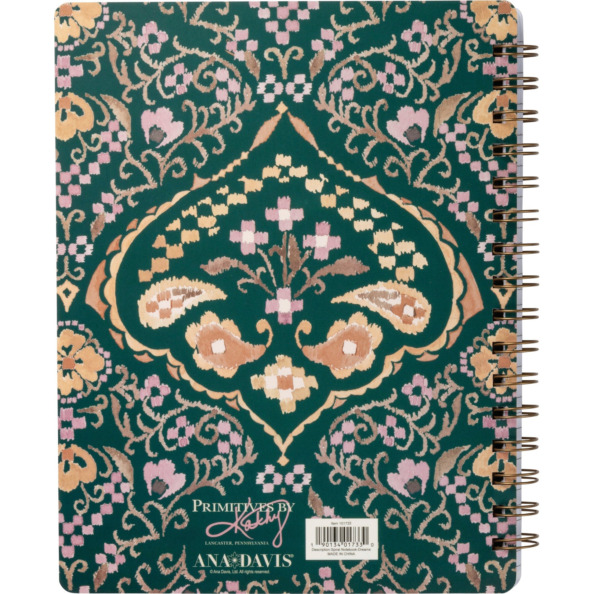 A spiral notebook featuring a front "Let Your Dreams Blossom" sentiment and floral paisley print throughout in a blush, metallic, and emerald palette. Contains 120 lined pages.