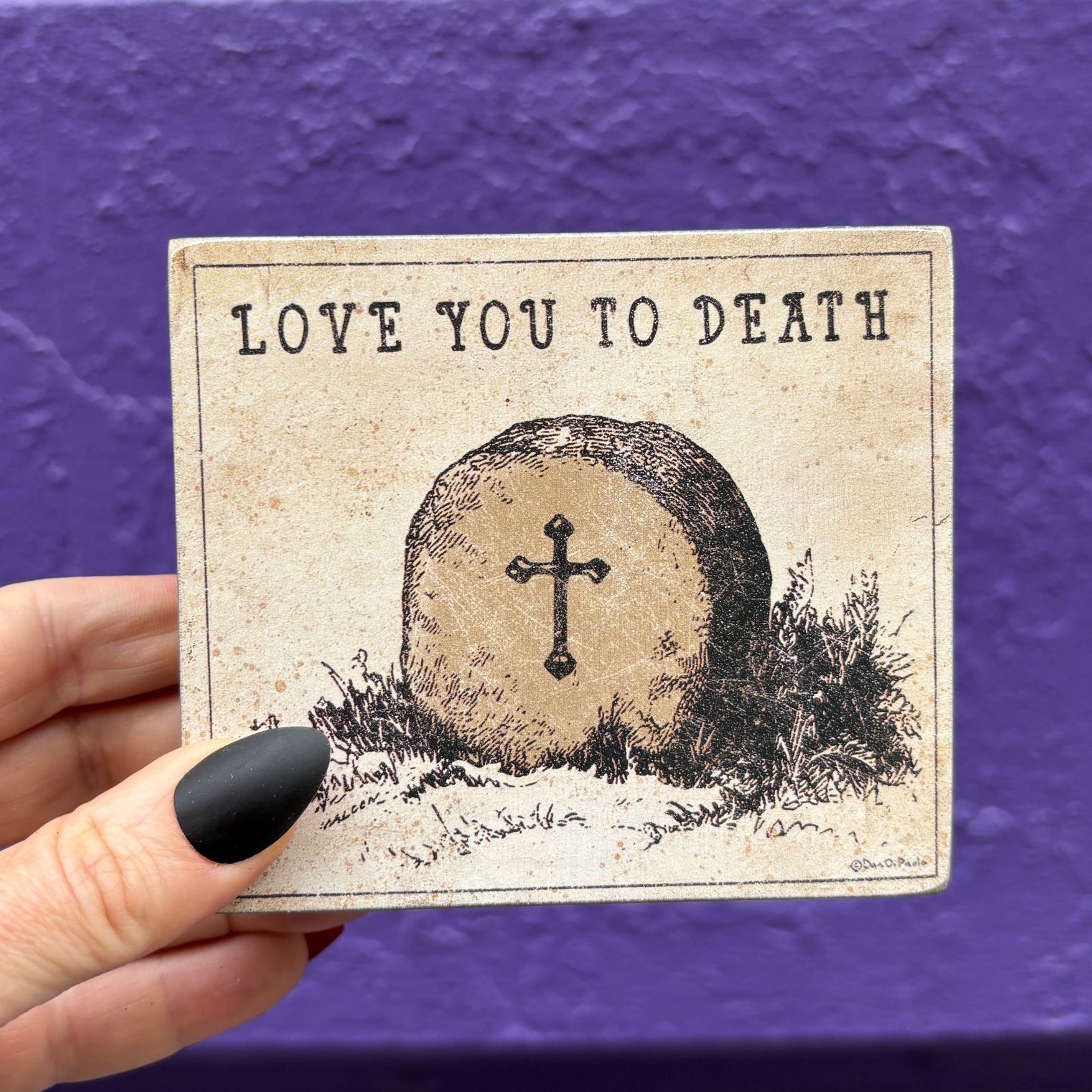 Love You To Death Vintage Art of a Grave Stone Block Sign | Wooden Halloween Decor | 4" x 3.50"
