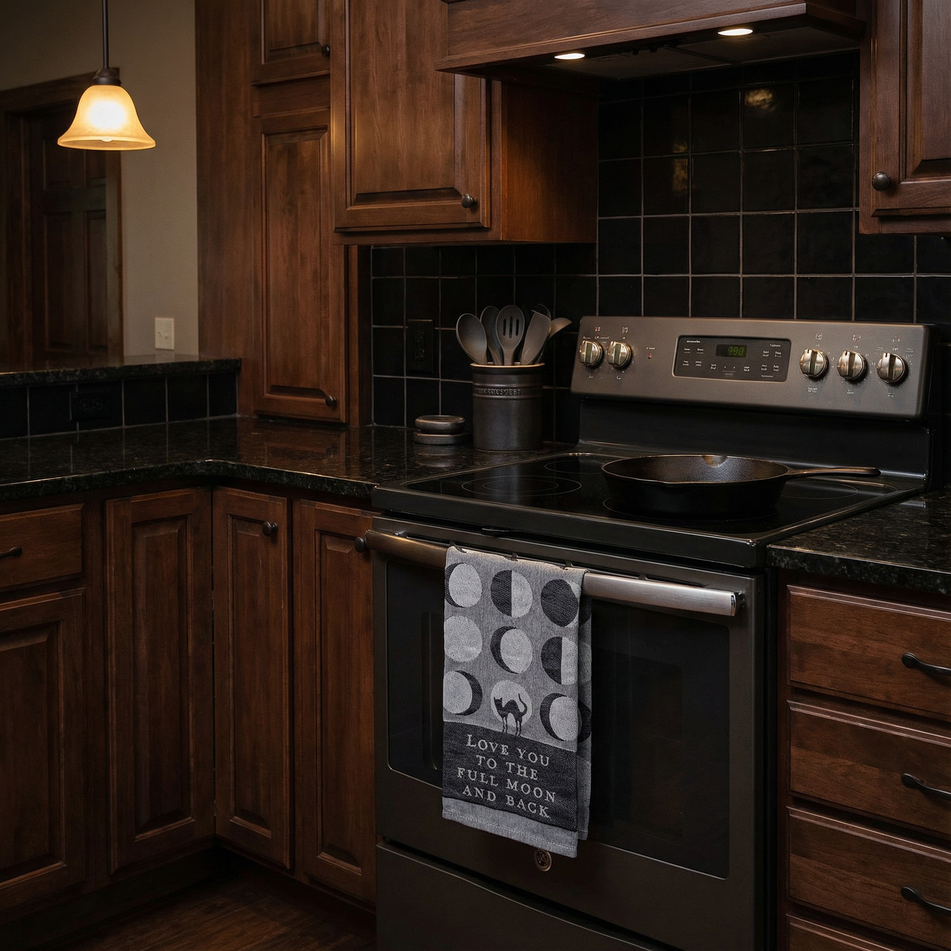 Brighten up your kitchen with the Love You To The Full Moon And Back Kitchen Towel featuring a unique black cat moon phases design. This 20" x 28" cotton towel is perfect for adding a touch of whimsy while drying dishes or wiping up spills, making it a thoughtful gift for cat lovers or anyone who enjoys celestial motifs.