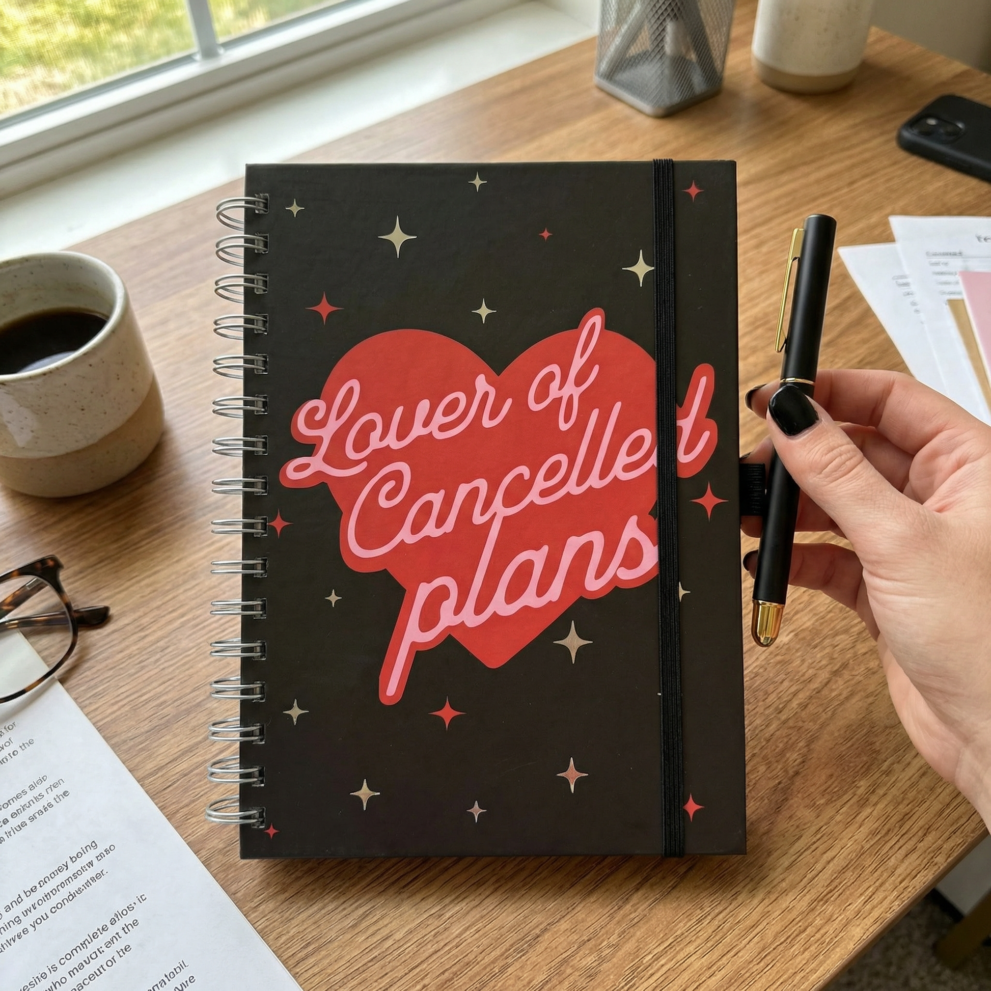 The hardcover journal features a bold black cover with a red heart and playful script text. And the best part? It comes with a matching pen that reads “Cancelled Plans Are My Favorite Plans.”