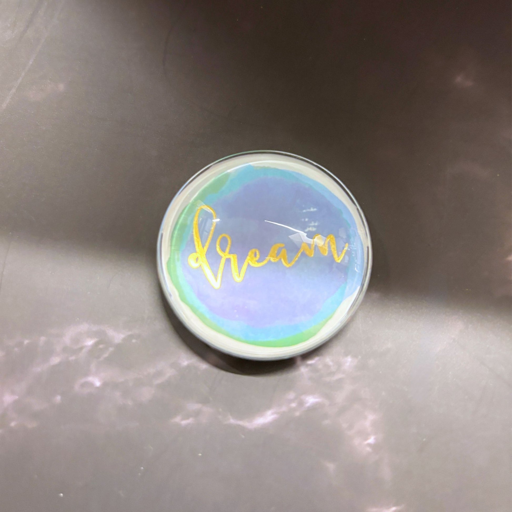 Round glass magnet featuring assorted sayings in metallic gold lettering: