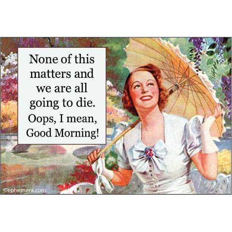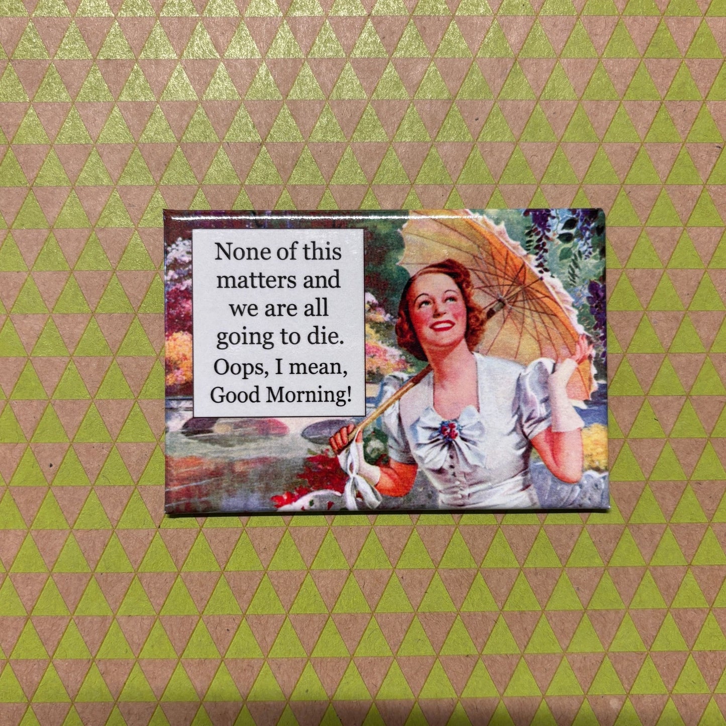 Rectangular magnet reads:Ā "None Of This Matters And We Are All Going To Die. Oops, I Mean, Good Morning!"