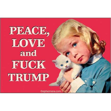 Add a touch of humor and bold statement with this magnet: ''Peace, Love and Fuck Trump.''