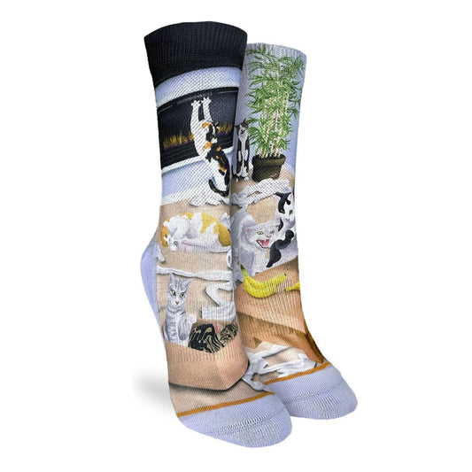 Cats Causing Catastrophe Women's Socks in Lilac | Mischief Cat Design Crew Socks