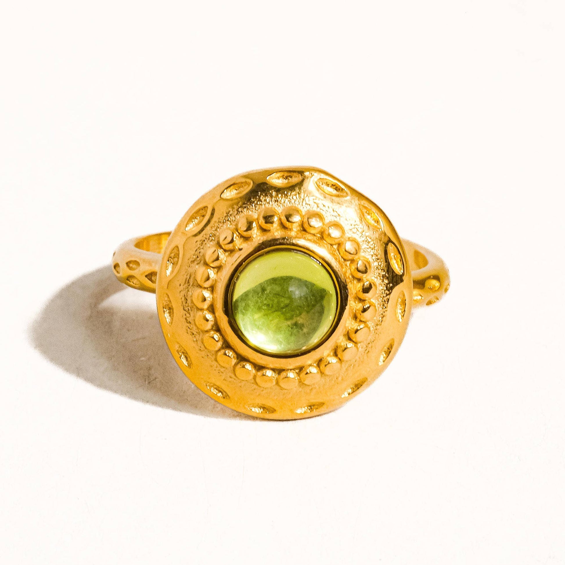 Featuring a luminous round glass stone set in richly textured 18K gold plating, this ring brings vintage-inspired charm with a modern finish.