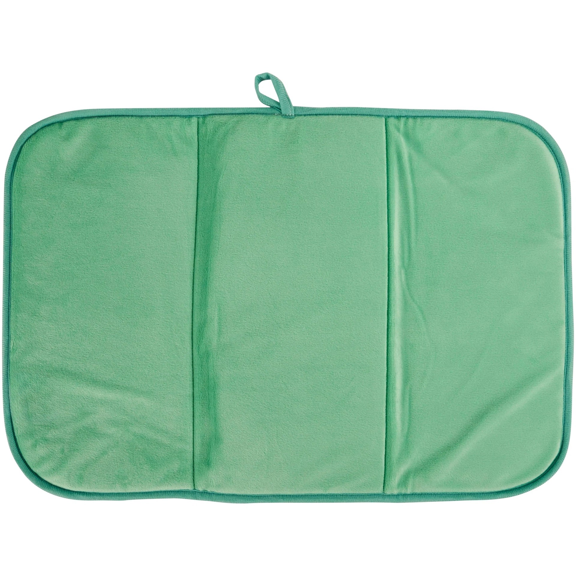 This drying mat features a full color design on the 21 inch by 14 inch space to place items to dry with coordinating green color on the back and trim.