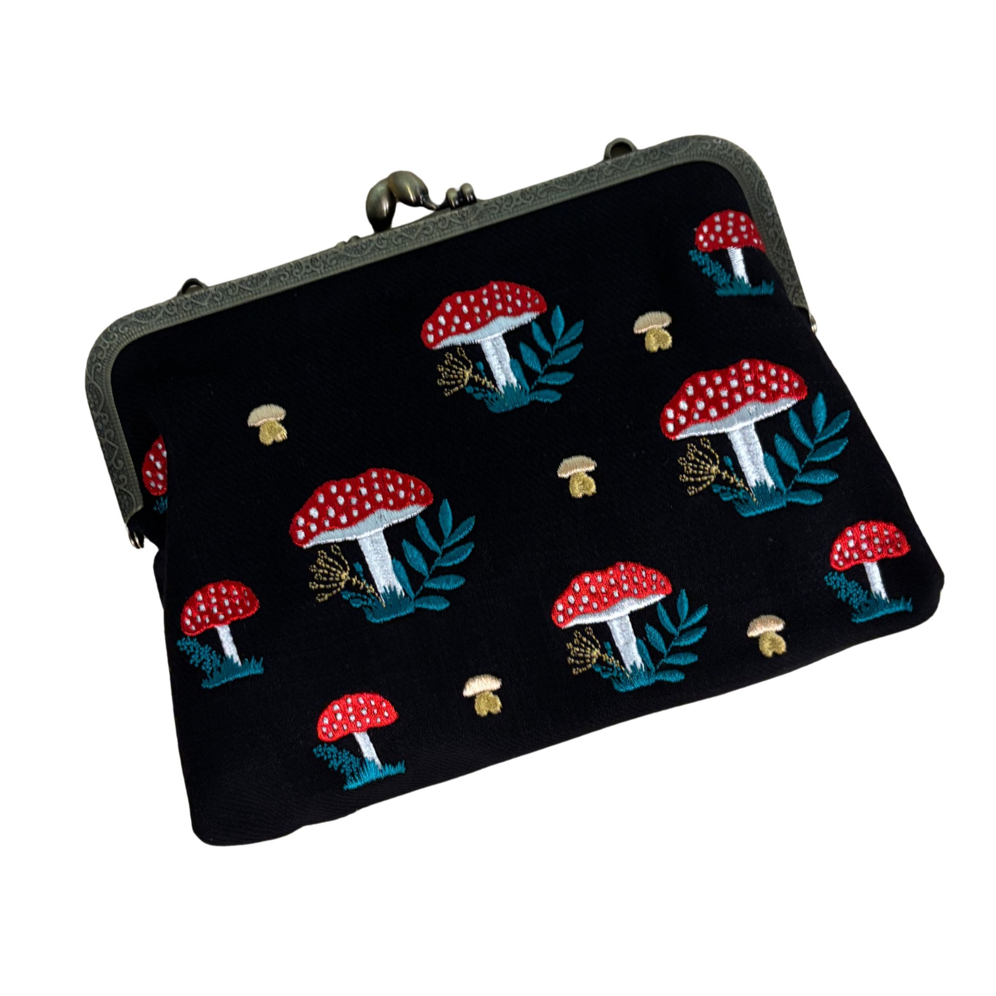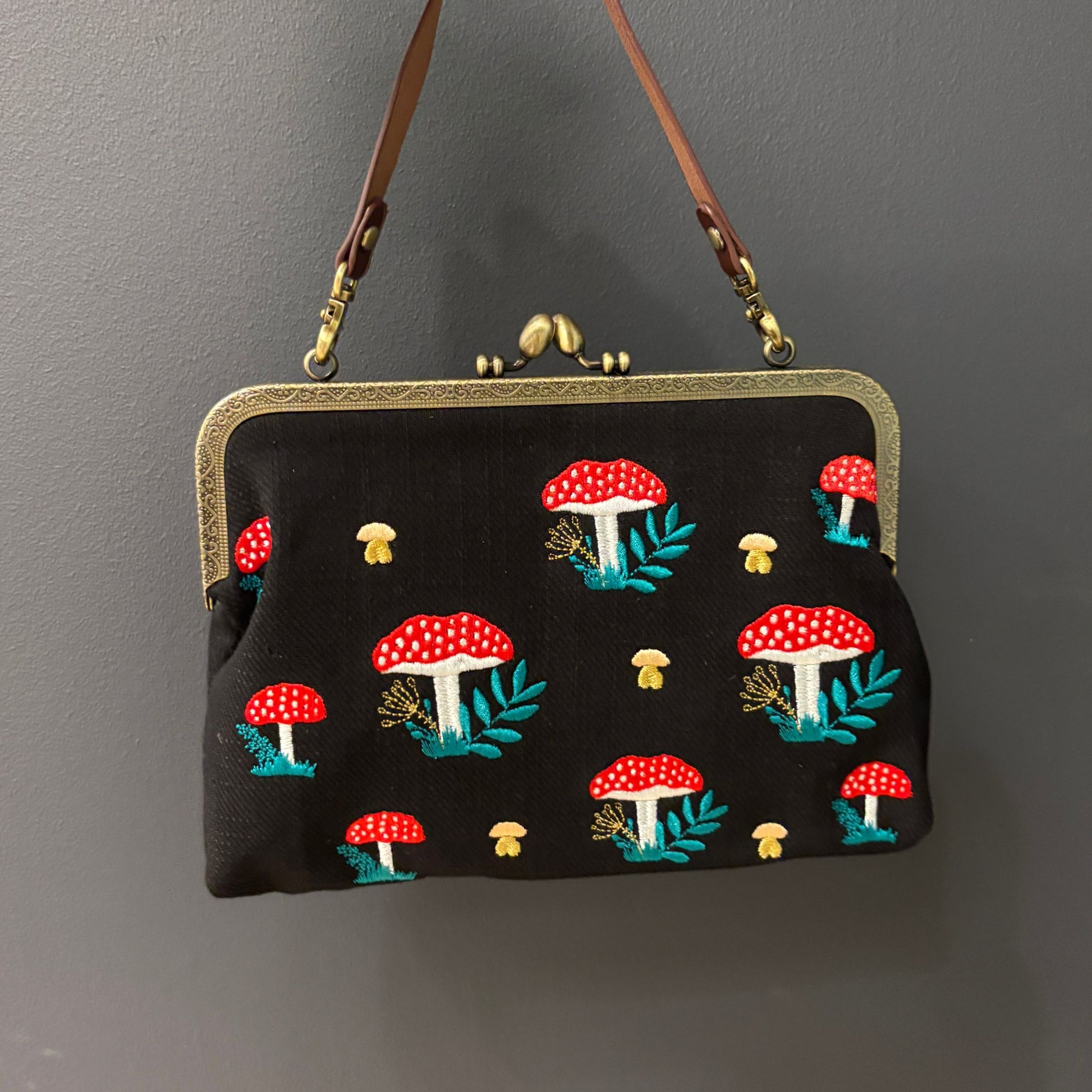 Mushrooms Kisslock Bag | Vintage Mushroom Purse with Detachable Straps in Black