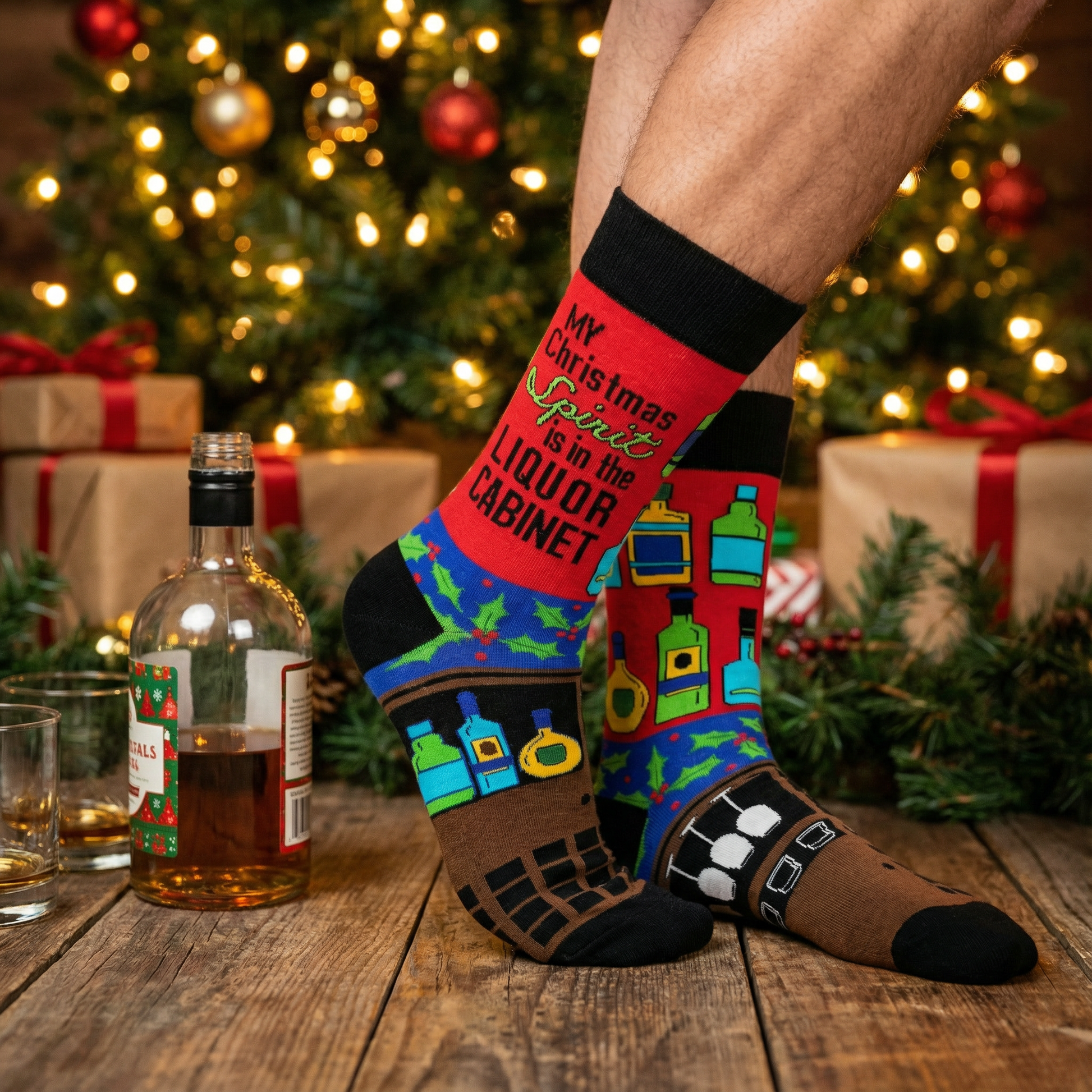 These novelty crew socks with the "My Christmas Spirit is in the Liquor Cabinet" design make a memorable stocking stuffer for the man who thrives on humor and holiday spirit (or lack thereof). They’re a solid choice for:
