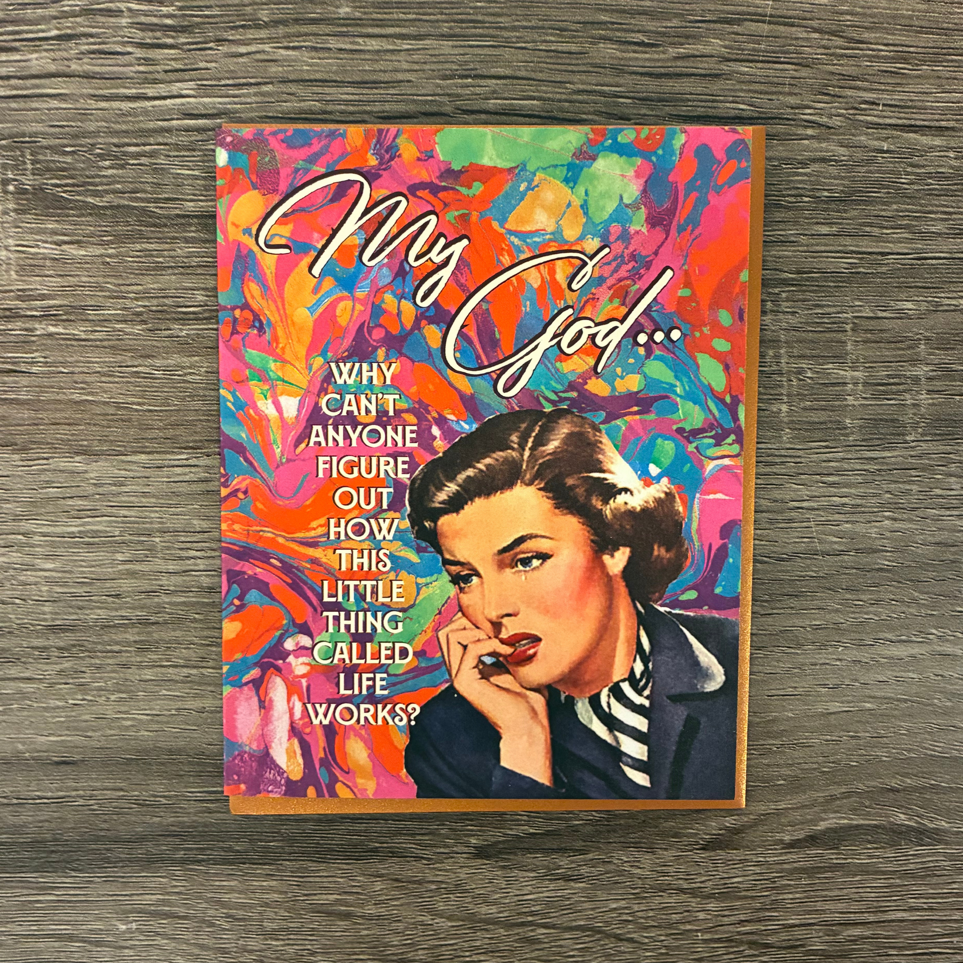 Card reads: "My God...Why can't I figure out how this little thing called life works?"