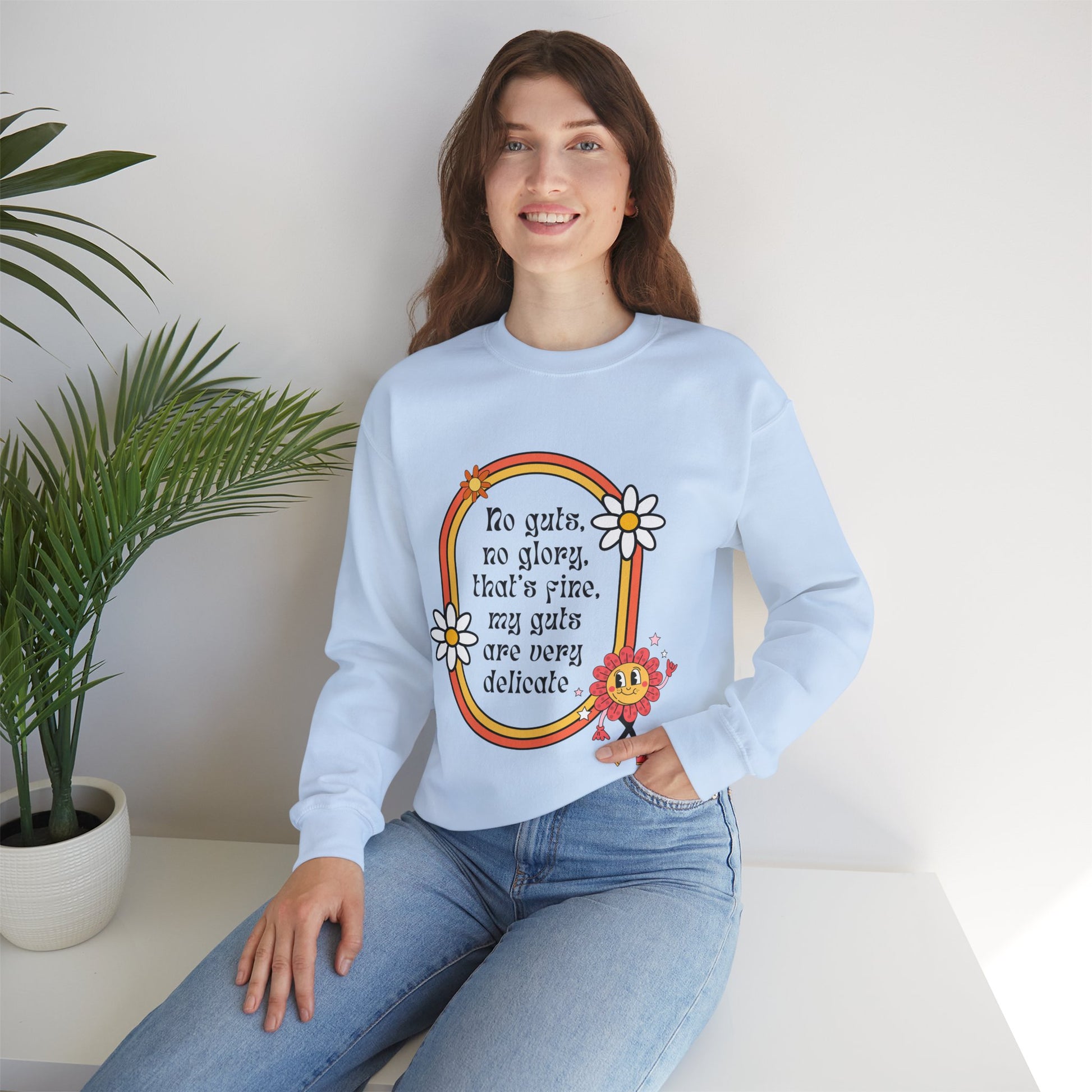Show off your sassy side with confidence in this unisex heavy blend crewneck sweatshirt. Made from a comfortable blend of polyester and cotton, this sweater features a ribbed knit collar that retains its shape wash after wash. The retro design proudly displays the phrase, "No Guts, No Glory, That's Fine, My Guts are Very Delicate," making it a perfect gift for anyone with an appreciation for snarky humor.
