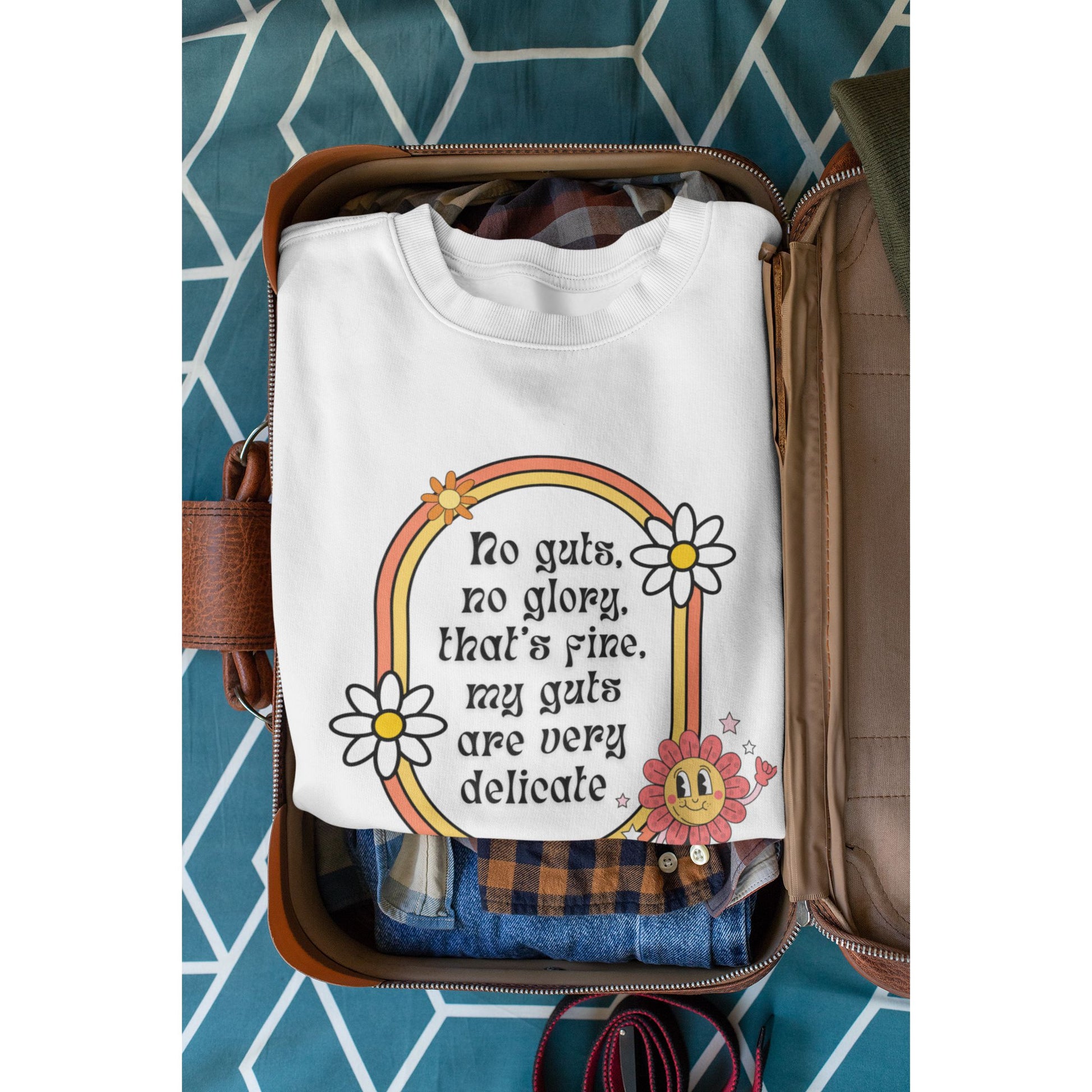 Features a classic retro design that proudly displays the phrase, "No Guts, No Glory, That's Fine, My Guts are Very Delicate." Perfect for anyone with an appreciation for snarky humor. Show off your sassy side with confidence!