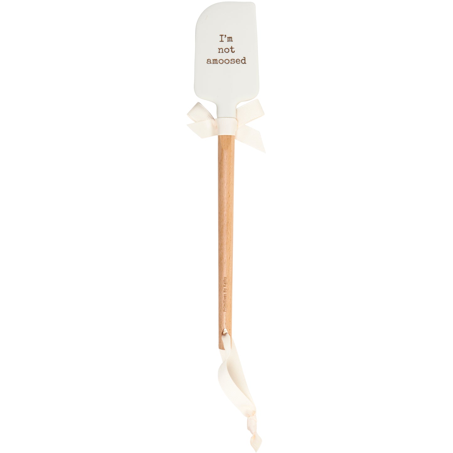 Logo is engraved into wooden handle for added interest. Not Amoosed spatula includes a complementing decorative bow and hole at the bottom for hanging.